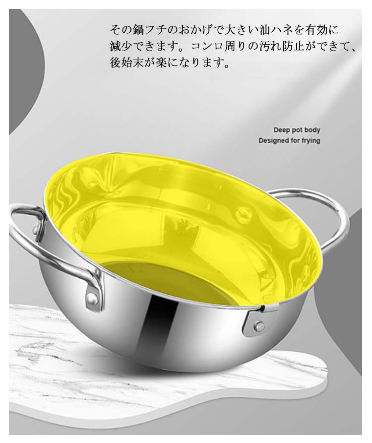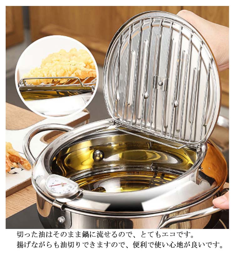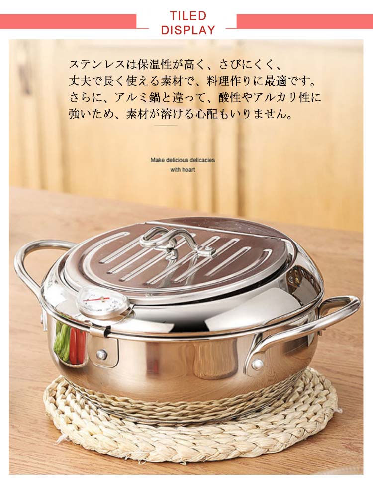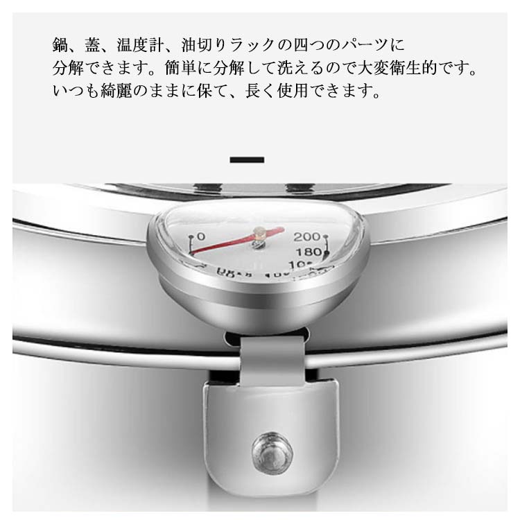 【ステレンス製】ステンレスは保温性が高く、さびにくく、丈夫で長く使える素材で、料理作りに最適です。さらに、アルミ鍋と違って、酸性やアルカリ性に強いため、素材が溶ける心配もいりません。【油はねガード】周りには丸く囲むような油はねそ防止ガードがついております。その鍋フチのおかげで大きい油ハネを有効に減少できます。コンロ周りの汚れ防止ができて、後始末が楽になります。【油切りラック】フタの裏側には油切りラックがついておりますので、別途用意する必要はいりません。切った油はそのまま鍋に流せるので、とてもエコです。揚げながらも油切りできますので、便利で使い心地が良いです。【丸洗い可能】鍋、蓋、温度計、油切りラックの四つのパーツに分解できます。簡単に分解して洗えるので大変衛生的です。いつも綺麗のままに保て、長く使用できます。