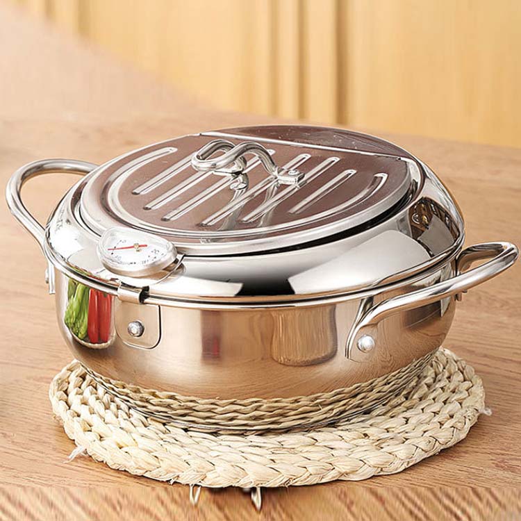 | 【ステレンス製】ステンレスは保温性が高く、さびにくく、丈夫で長く使える素材で、料理作りに最適です。さらに、アルミ鍋と違って、酸性やアルカリ性に強いため、素材が溶ける心配もいりません。 【油はねガード】周りには丸く囲むような油はねそ防止ガードがついております。その鍋フチのおかげで大きい油ハネを有効に減少できます。コンロ周りの汚れ防止ができて、後始末が楽になります。 【油切りラック】フタの裏側には油切りラックがついておりますので、別途用意する必要はいりません。切った油はそのまま鍋に流せるので、とてもエコです。揚げながらも油切りできますので、便利で使い心地が良いです。 【丸洗い可能】鍋、蓋、温度計、油切りラックの四つのパーツに分解できます。簡単に分解して洗えるので大変衛生的です。いつも綺麗のままに保て、長く使用できます。 | |