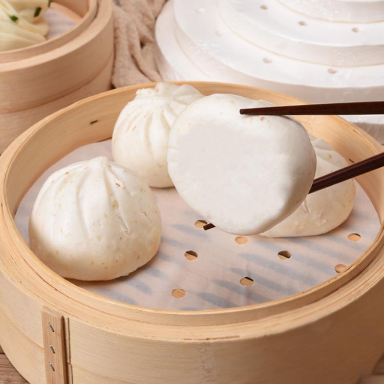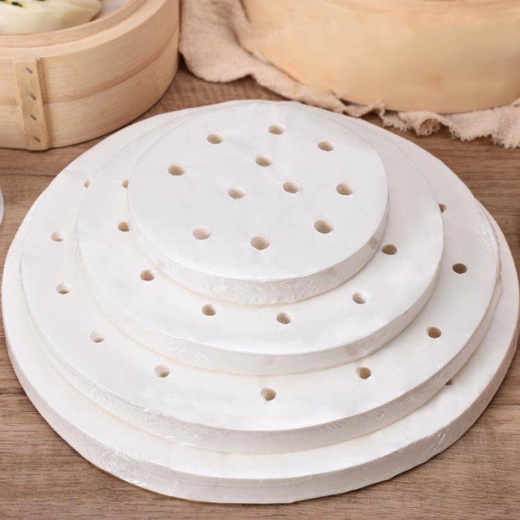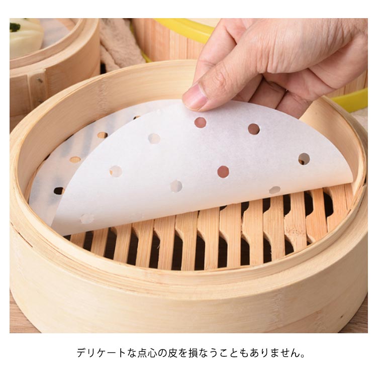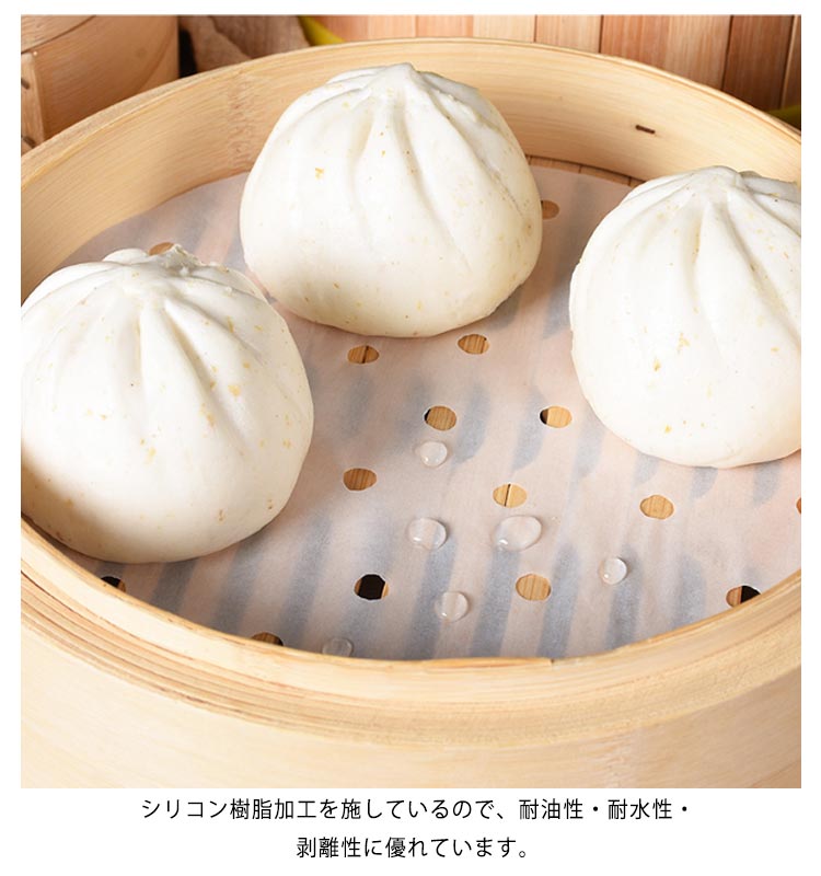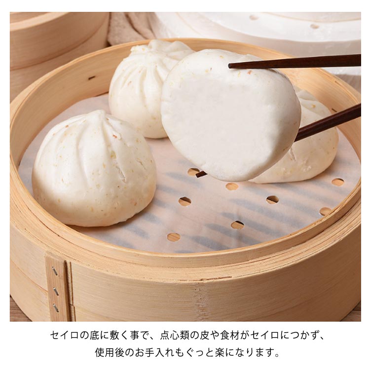 衛生的でお手入れ簡単!穴あき加工でせいろ専用設計。せいろ用クッキングシート。 100枚入りシリコン樹脂加工を施しているので、耐油性・耐水性・剥離性に優れています。セイロの底に敷く事で、点心類の皮や食材がセイロにつかず、使用後のお手入れもぐっと楽になります。デリケートな点心の皮を損なうこともありません。サイズは7.6cm用~26.7cm用までの16サイズとなっており、用途に合わせてお選びください。