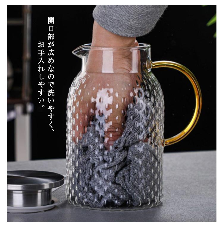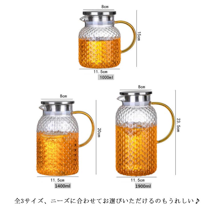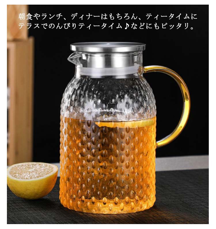 1/1.4/1.9L!温かい飲み物にも冷たい飲み物にも使える耐熱ガラス製のピッチャー-30℃~150℃対応可能、沸かしたお茶も入れますし、アイスコーヒーも手軽にできて一年中重宝します。二つの機能を付けたフィルター、ニーズに合わせて転換可能です。電気陶炉、ガスコンロともご使用可能です。(IH調理器対応できません)朝食やランチ、ディナーはもちろん、ティータイムにテラスでのんびりティータイム♪などにもピッタリ。開口部が広めなので洗いやすく、お手入れしやすい。爽やかな触感 ほどよいの手持ち感、ご自分用はもちろん、プレゼントとしてもオススメ。全3サイズ、ニーズに合わせてお選びいただけるのもうれしい♪