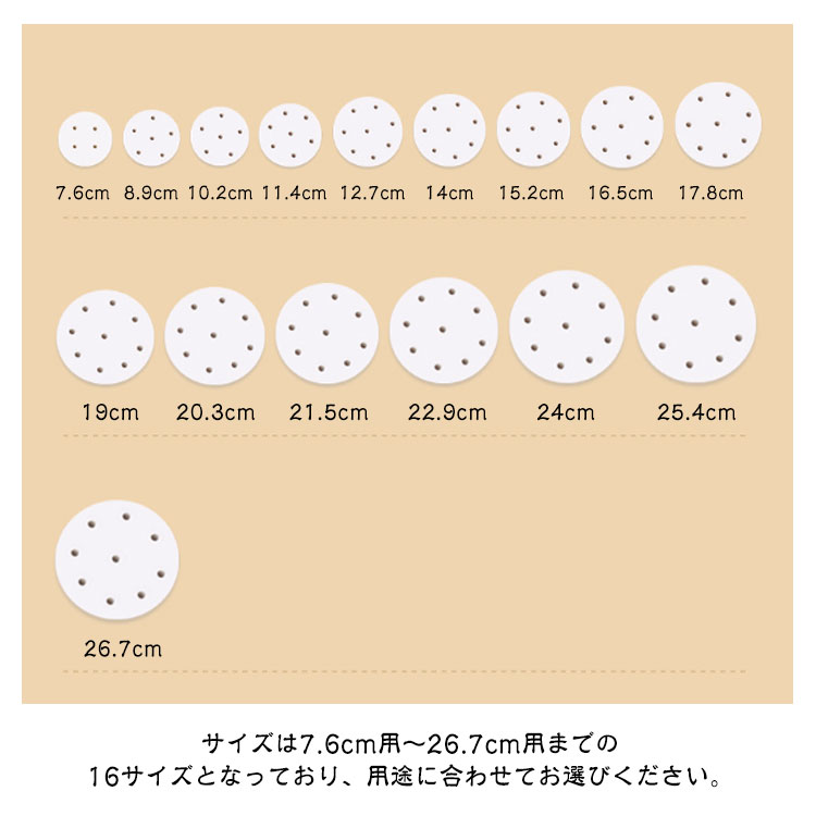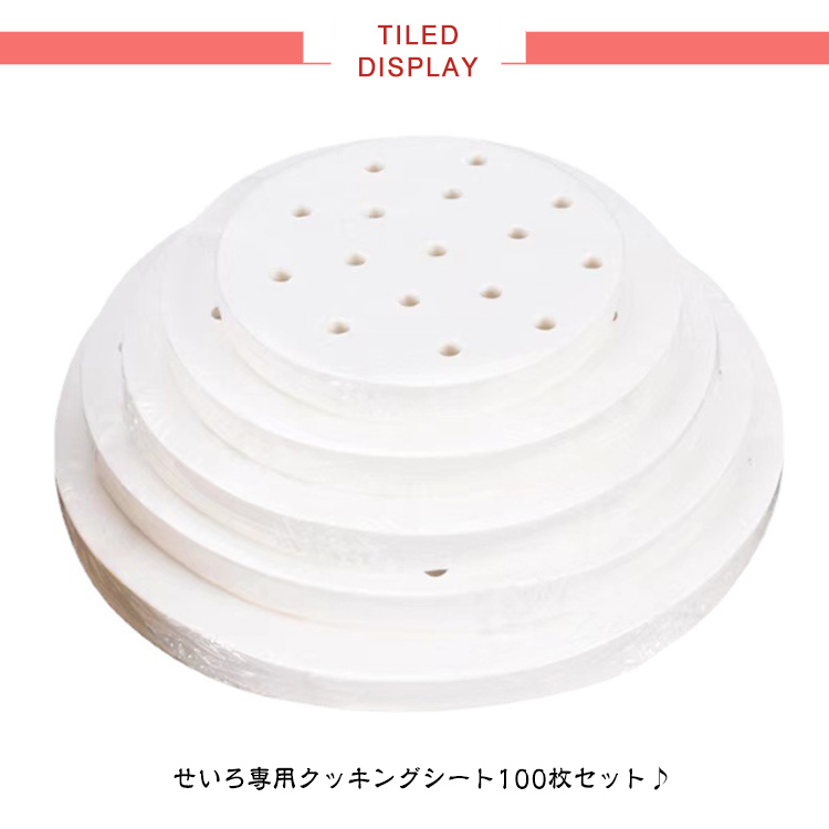 穴あき加工でせいろ専用設計。せいろ専用クッキングシート100枚セット♪シリコン樹脂加工を施しているので、耐油性・耐水性・剥離性に優れています。セイロの底に敷く事で、点心類の皮や食材がセイロにつかず、使用後のお手入れもぐっと楽になります。蒸気の通る穴があるから効率よく蒸せます。サイズは7.6cm用~26.7cm用までの16サイズとなっており、用途に合わせてお選びください。