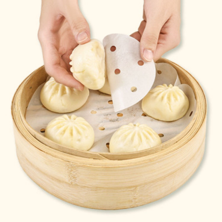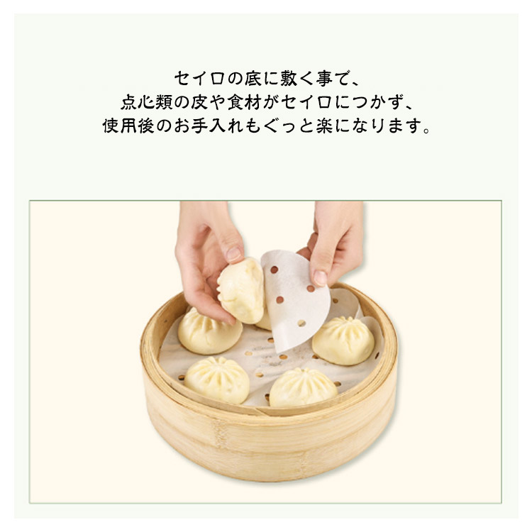 | 穴あき加工でせいろ専用設計。せいろ専用クッキングシート100枚セット? シリコン樹脂加工を施しているので、耐油性?耐水性?剥離性に優れています。 セイロの底に敷く事で、点心類の皮や食材がセイロにつかず、使用後のお手入れもぐっと楽になります。 蒸気の通る穴があるから効率よく蒸せます。 サイズは7.6cm用~26.7cm用までの16サイズとなっており、用途に合わせてお選びください。 | |