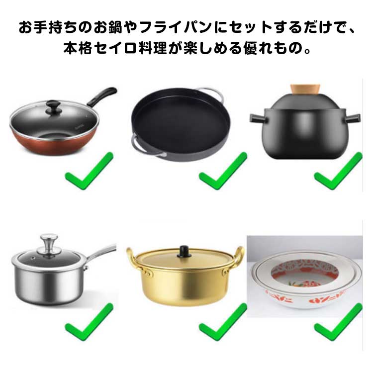 | 蒸し板があるとお手持ちの鍋に合わせて気軽に蒸し料理が楽しめます。 受け台はには段付き加工が施されています。 ステンレス製で、耐腐食性があり、サビに強く、丈夫でお手入れも簡単です。 蒸気口が広いので蒸しセイロの効率が良く、料理の制作時間を短縮できます。 お手持ちのお鍋やフライパンにセットするだけで、本格セイロ料理が楽しめる優れもの。 サイズは内径18cm~30cmまでの7サイズとなっております。 | |
