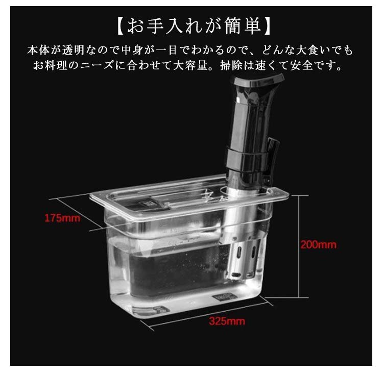| 【6L 】低温調理器専用フードコンテナ 【低温調理器専用フードコンテナ】:大容量で蓋が付いている角型フードコンテナーので、優れた低温L調理法保存容器+蓋セットデザインで便利です。低温調理器と併用することで、より効果的に美味しい料理を作ることができます。 【便利】:食品に簡単にアクセスできるようにするには、蓋を中央に折り畳むだけでいつでも水槽内の食品を追加または除去できます。頑丈なヒンジは、100,000回の使用に適していることがテストされていますバッグクランプ不要、柔軟なフリープラスチック製のふたは、バッグ内の泳ぎを防ぐために容器に密封してください 【安全安心の材質】調理容器は、食品安全ポリカーボネート材質で作られて、安心して料理を作ることができます。さらに、調理容器は耐熱性が高く、お手入れも簡単です。 耐久性のあるポリカーボネートで作られており、より長い寿命が保証されています。 【お手入れが簡単】:本体が透明なので中身が一目でわかるので、どんな大食いでもお料理のニーズに合わせて大容量。掃除は速くて安全です。 【複数の使用法】:細かい細工ロング確保することができ時間の使用とワイドアプリケーション。 | |
