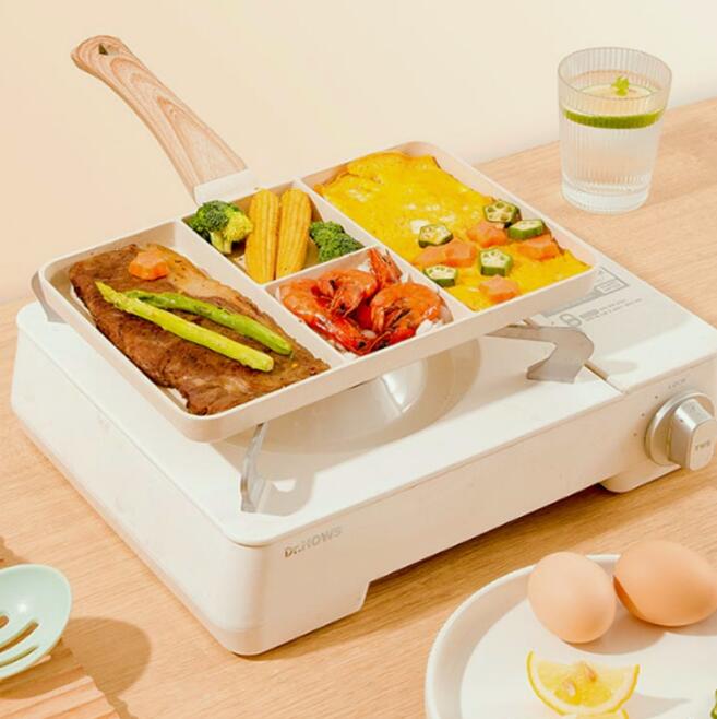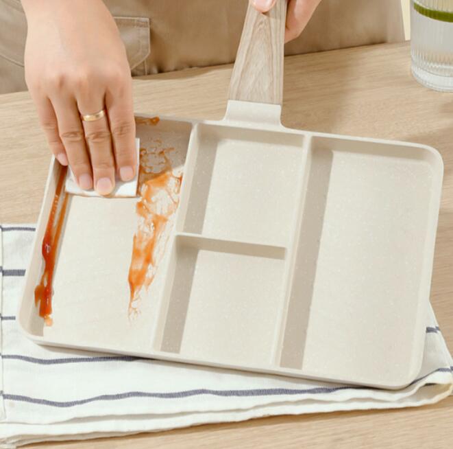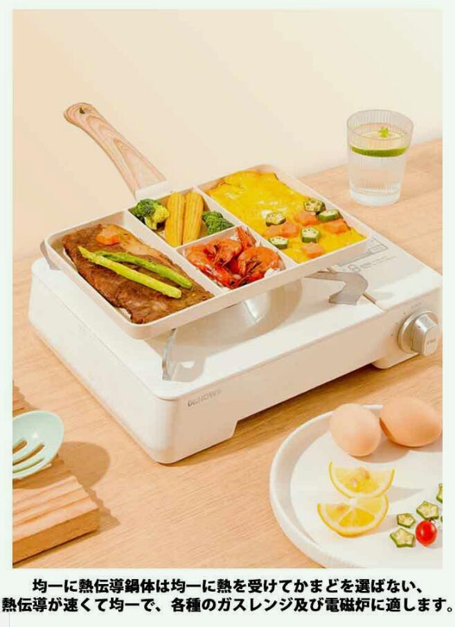 【四つ料理同時に作れる】【IH・ガス火対応】4つの仕切りにより、目玉焼き、ソーセージ、卵焼き、角玉子焼などを綺麗に仕上げます。忙しい朝に弁当のおかずや朝食作りにもとても便利です。均一に熱伝導鍋体は均一に熱を受けてかまどを選ばない、熱伝導が速くて均一で、各種のガスレンジ及び電磁炉に適します。持ち手が掛けられる設計で、場所を取らず、省スペースで便利。マーブルコートをしているため、焦げ付きにくくスムーズに調理できます。調理後のお手入れもラクラク、汚れもスルッと落ちます。機能性に拘るだけではなく、見た目も重視されています。オシャレなデザインにより、キッチンを明るく、日々のお調理がより一層楽しくなります