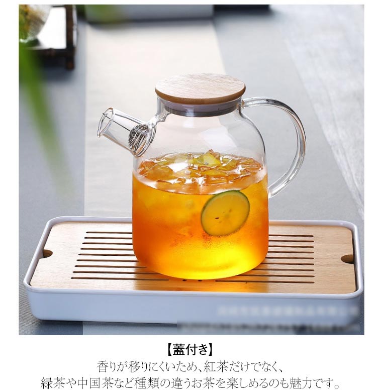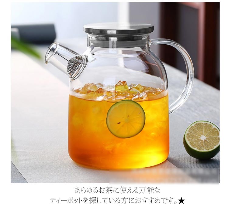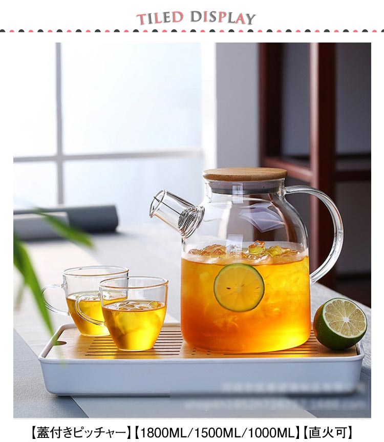 【蓋付きピッチャー】【1800ml/1500ml/1000ml】【直火可】【直火対応】耐熱ガラスで作られて、直火可能なガラスポットです。温かい飲み物にも冷たい飲み物にも使える耐熱ガラス製のピッチャーです。沸かしたお茶も入れますし、アイスコーヒーも手軽にできて一年中重宝します。【-30℃~150℃対応】麦茶、紅茶、ジュース、コーヒー、ミルクなどの飲み物を淹れたい時にご気楽にお使えいただけます。-30℃~150℃、耐熱ガラスので、温かい飲み物にも冷たい飲み物にも使える耐熱ガラス製のピッチャーです【簡単に洗える】ボトルの口径が大きく、手が直接差し込めて清潔できます。あらゆるお茶に使える万能なティーポットを探している方におすすめです。★【蓋付き】香りが移りにくいため、紅茶だけでなく、緑茶や中国茶など種類の違うお茶を楽しめるのも魅力です。麦茶、紅茶、花茶、ハーブティー、工芸茶、ジュース、コーヒーなどを入れます。