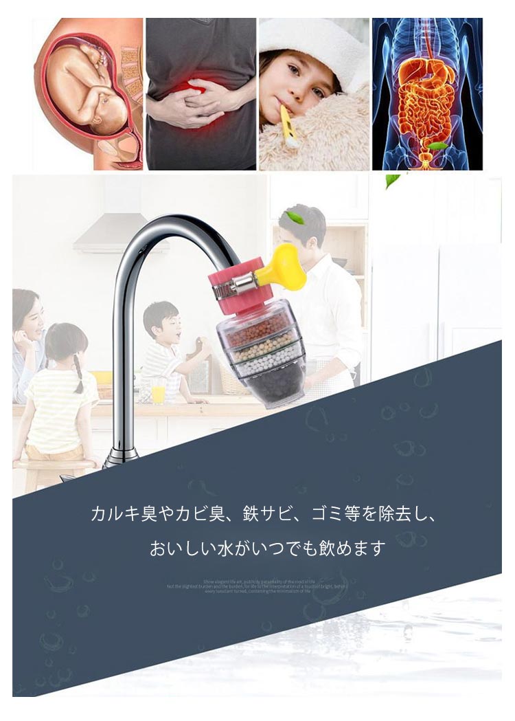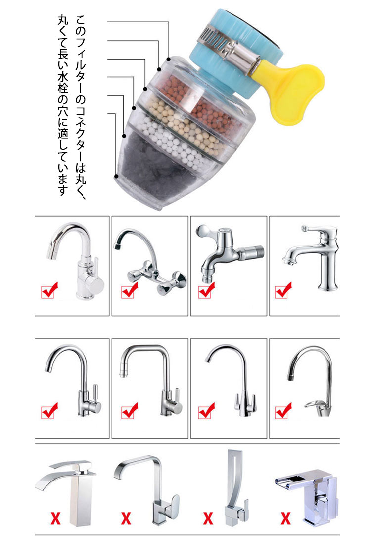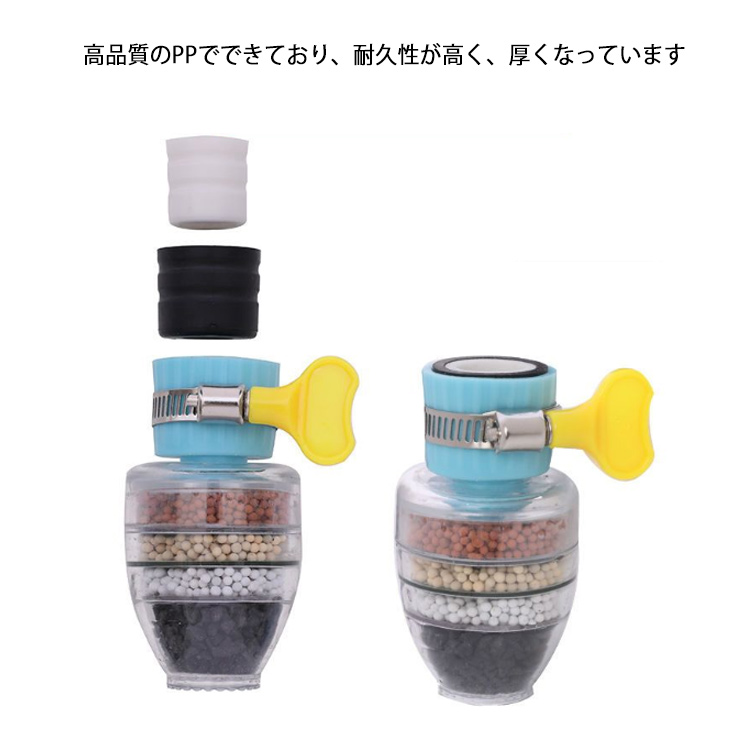 安定した構造、長寿命、漏れ防止、節水の6層濾過蛇口浄水器カルキ臭やカビ臭、鉄サビ、ゴミ等を除去し、おいしい水がいつでも飲めますこのフィルターのコネクターは丸く、丸くて長い水栓の穴に適しています高品質のPPでできており、耐久性が高く、厚くなっています360度の回転機能により、シンクのあらゆるブラインドアングルをきれいにできます
