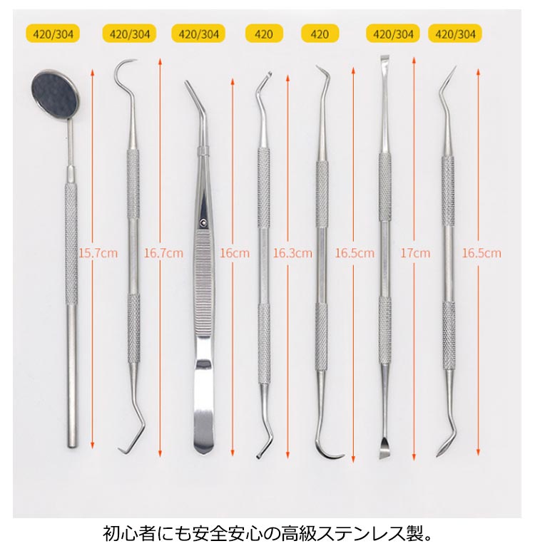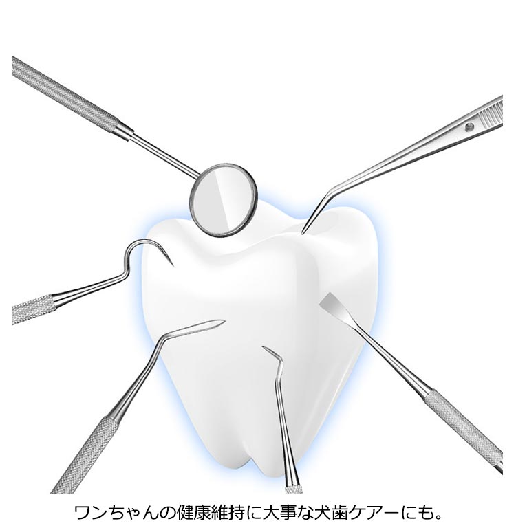 | 自宅で本格汚れ除去、充実の8点セット。 高級ステンレス製歯用ツール、ご家庭でも使えるプロ用セット。 初心者にも安全安心の高級ステンレス製。 自宅で手軽に 食べかす、歯石、歯垢、虫歯、色素沈着に、本格的な口内ケアを。 ワンちゃんの健康維持に大事な犬歯ケアーにも。 人体工学 ツールの先端が鋭いので簡単に汚れ除去をすることが出来ます。 耐久性と防カビ性にすぐれ、滑り止め設計されているので持ちやすい。 | |