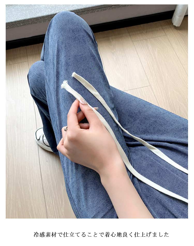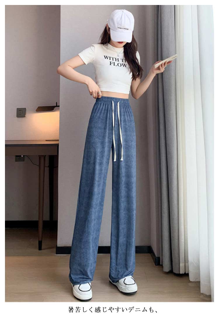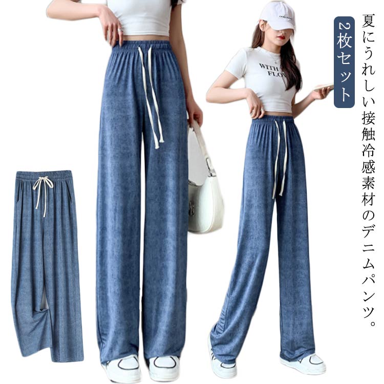 デニム ストレート レディース 冷感 ワイドパンツ 夏 夏用 デニムパンツ 2枚組 レディース ワイドパンツ ウエストゴム デニム 接触冷感 春 夏 ひんやり UVカット 無地 薄手 涼しい ロング丈 ストレートパンツ ジーンズ 体型カバー