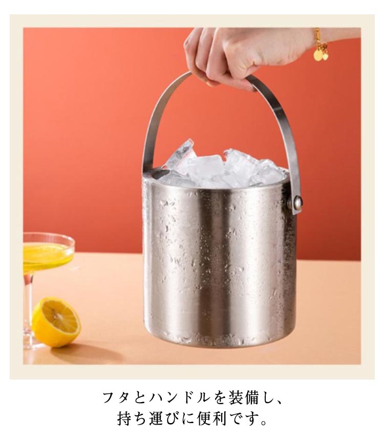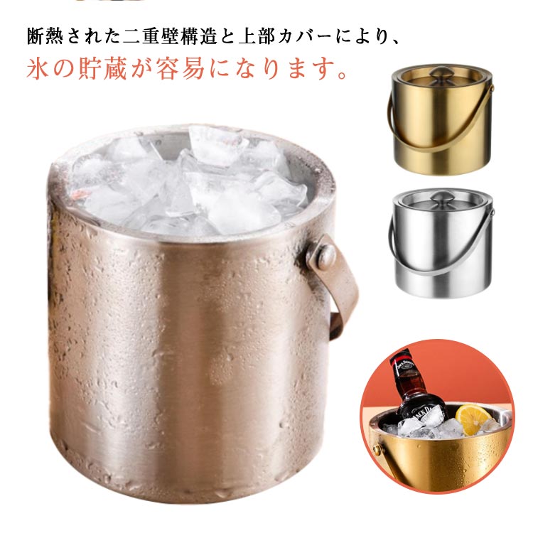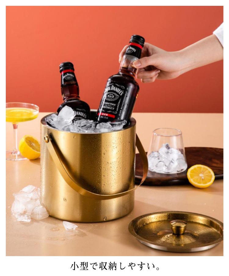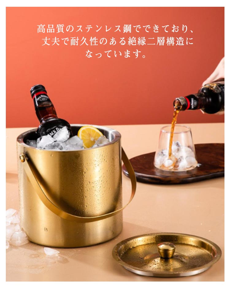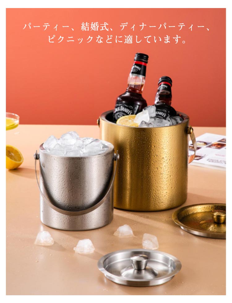ゴールド アイスバケット 1.6L 2L ワインクーラー 蓋付き アイススクープ 二重壁断熱 ステンレス鋼 氷バケツ ワイン 酒 クーラー ポータブル ハンドル付き 真空二重 大型 アイスペール 溶けにくい シャンパンクーラー