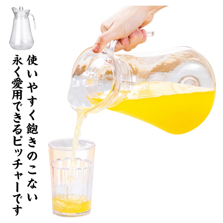 業務用に人気の定番の形。使いやすく飽きのこない、永く愛用できるピッチャーです。ジュース、ビール、アイスティー、自家製飲料、牛乳などに使用するための耐寒性と耐熱性。感謝祭のディナーやパーティー、ピクニック、プールで友達や家族と楽しむのに最適です。蓋はボトルにぴったりとフィットし、スライドが容易ではないため、水を注ぐのが簡単になります。ウォーターピッチャーは、食品に安全な高品質のプラスチック素材でできており、健康に害はありません。