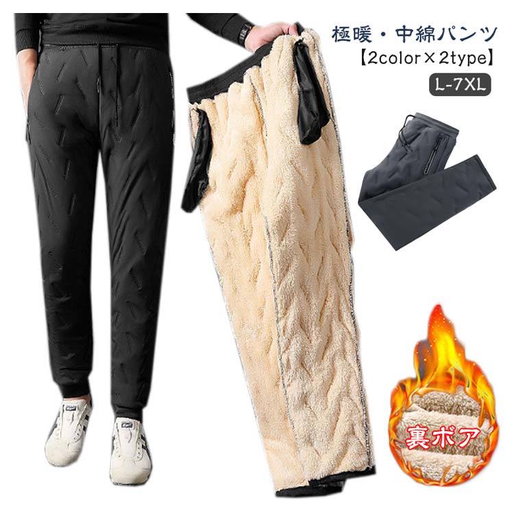 【極暖・中綿パンツ】【L-7XL】【2color×2type】【裏ボア】寒い季節には欠かせない、シンプルなデザインの中綿入りパンツ。暖かく動きやすい裏ボアジョガーパンツ/ストレートパンツ♪裏地はソフトな肌触りのボア素材で暖かく保温効果あり!両ポケットに長いジップの持ち手がついていて手袋をしていても開閉しやすいうれしい仕様。動きながらでもポケットから落ちにくいジップポケット。裾もリブとリブなしが選べてお好みに合わせていただけます。防水性もあり冬の悪天候の際なども体を芯から温めてくれるようなコタツの中にいるような着心地。