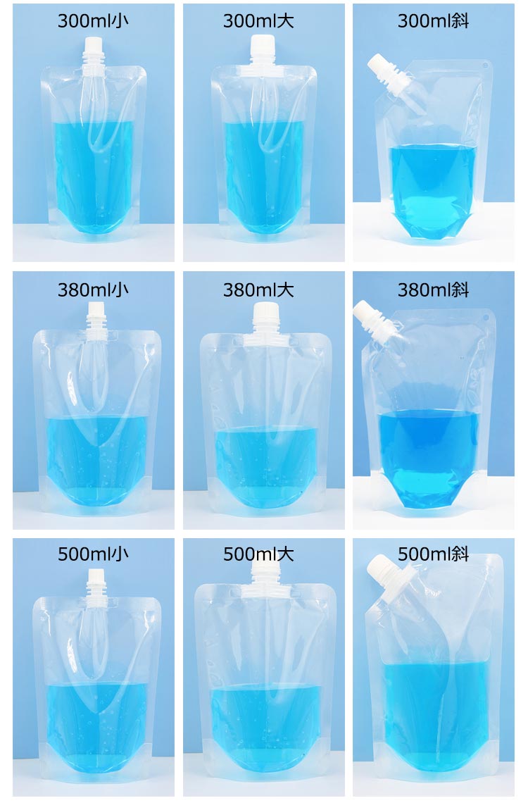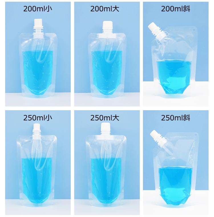 多種類の飲み口×全7サイズ!100ml/150ml/200ml/250ml/300ml/380ml/500mlの自立できるスタンドパウチ200個セットです。お湯OK、冷凍庫保存もOK!-20~100度まで耐えれます。お店で自家製ドリンク等を販売、クリアの容器ですのでお店のシールを貼ると一層魅力的な商品になります。ランニング時の水筒としても、ペットボトルと違って走っているときに揺れたり音がすることがないです。減った分はコンパクトにたたむ事が出来ます!!ボトルに比べて小さく折りたたんで廃棄でき、ゴミの減容化が可能、環境配慮型パッケージです。ゼリー飲料、ジャム、マスタード、ケチャップ、のり佃煮、ドレッシング、タルタルソース等にも。簡単便利なキャップ付きの規格袋です。水、ジュース、ミルクなどの飲み物の容器としてオススメ。キャップでしっかり密封すると漏れる心配がないんです。旅行なども携帯するのにも便利!