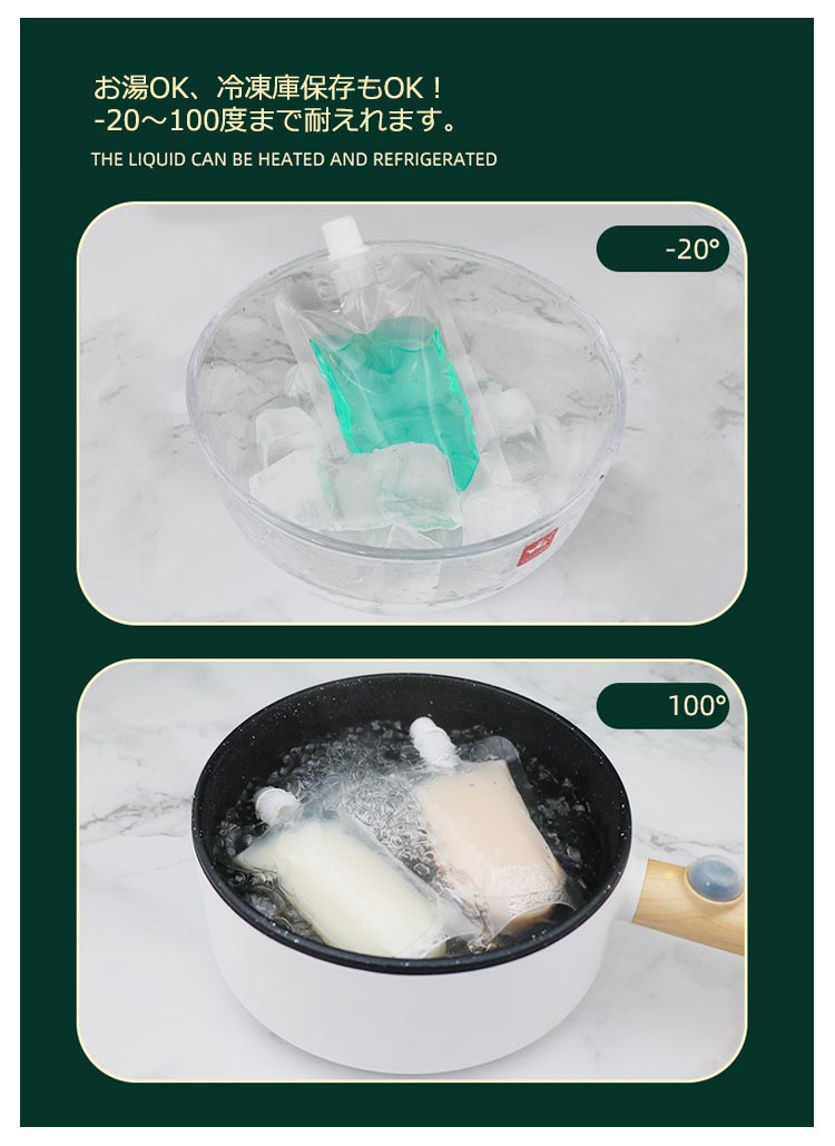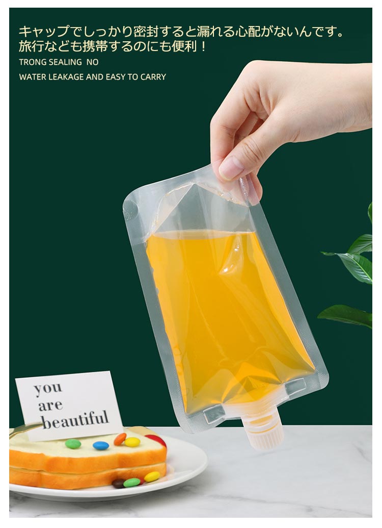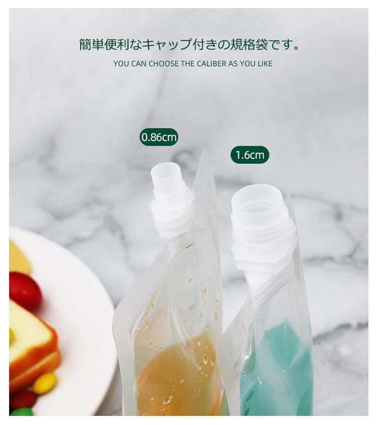 | 多種類の飲み口×全7サイズ!100ml/150ml/200ml/250ml/300ml/380ml/500mlの自立できるスタンドパウチ200個セットです。 お湯OK、冷凍庫保存もOK!-20~100度まで耐えれます。 お店で自家製ドリンク等を販売、クリアの容器ですのでお店のシールを貼ると一層魅力的な商品になります。 ランニング時の水筒としても、ペットボトルと違って走っているときに揺れたり音がすることがないです。 減った分はコンパクトにたたむ事が出来ます!! ボトルに比べて小さく折りたたんで廃棄でき、ゴミの減容化が可能、環境配慮型パッケージです。 ゼリー飲料、ジャム、マスタード、ケチャップ、のり佃煮、ドレッシング、タルタルソース等にも。 簡単便利なキャップ付きの規格袋です。 水、ジュース、ミルクなどの飲み物の容器としてオススメ。 キャップでしっかり密封すると漏れる心配がないんです。 旅行なども携帯するのにも便利! | |