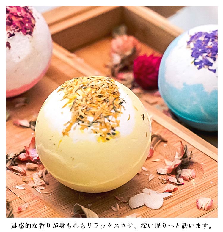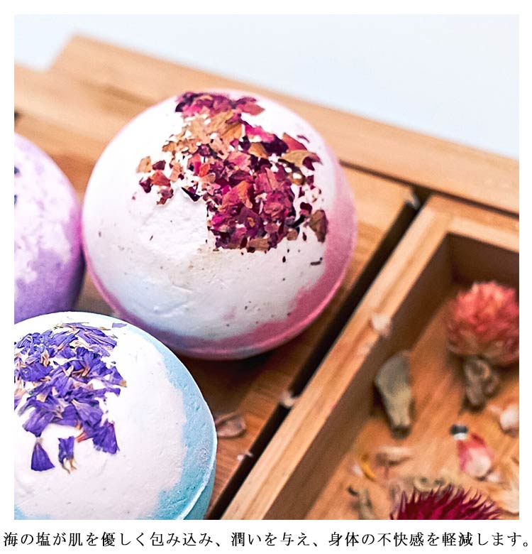 | お家で贅沢スバ気分!極上のバスタイムを演出するバスボール。 天然の海塩や天然エッセンシャルオイルなどを採用しており手作りされています。 ローズ、キンセンカ、ラベンダー、ランの4種類の香りで切り替えできます。 豊富なエッセンシャルオイルは水分を含み、肌の弾力性を維持します。 海の塩が肌を優しく包み込み、潤いを与え、身体の不快感を軽減します。 魅惑的な香りが身も心もリラックスさせ、深い眠りへと誘います。 華やかな見た目と実用性があって、ギフトとしても最適です。 | |