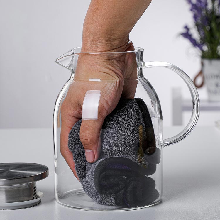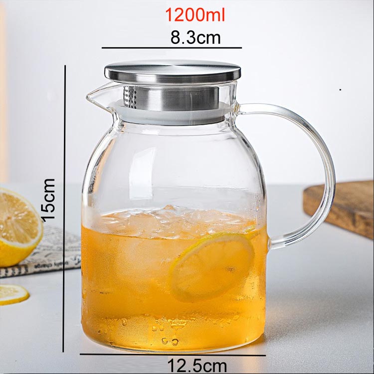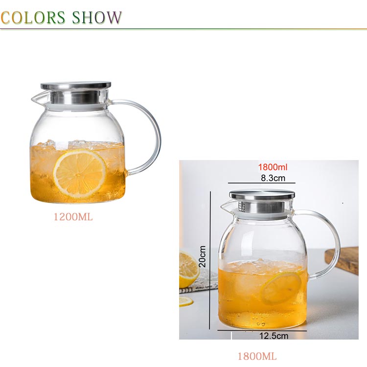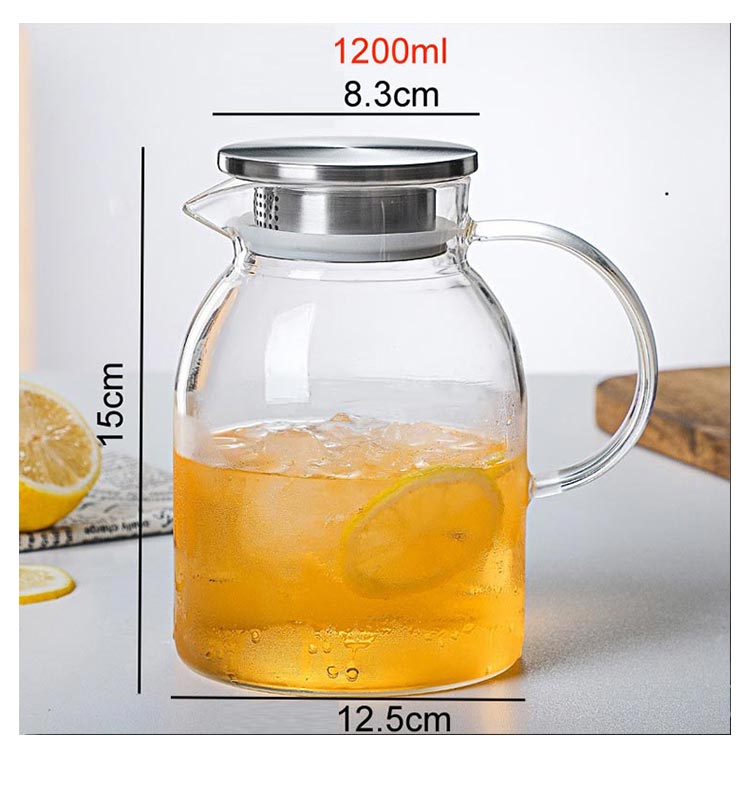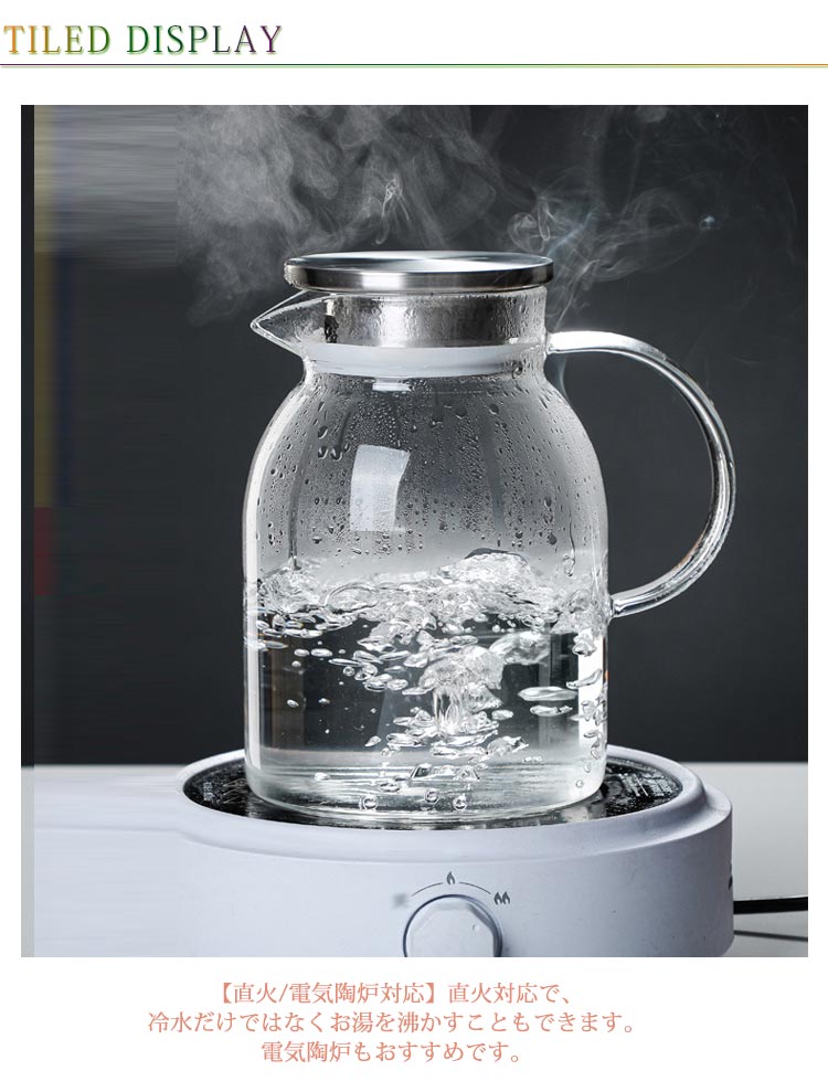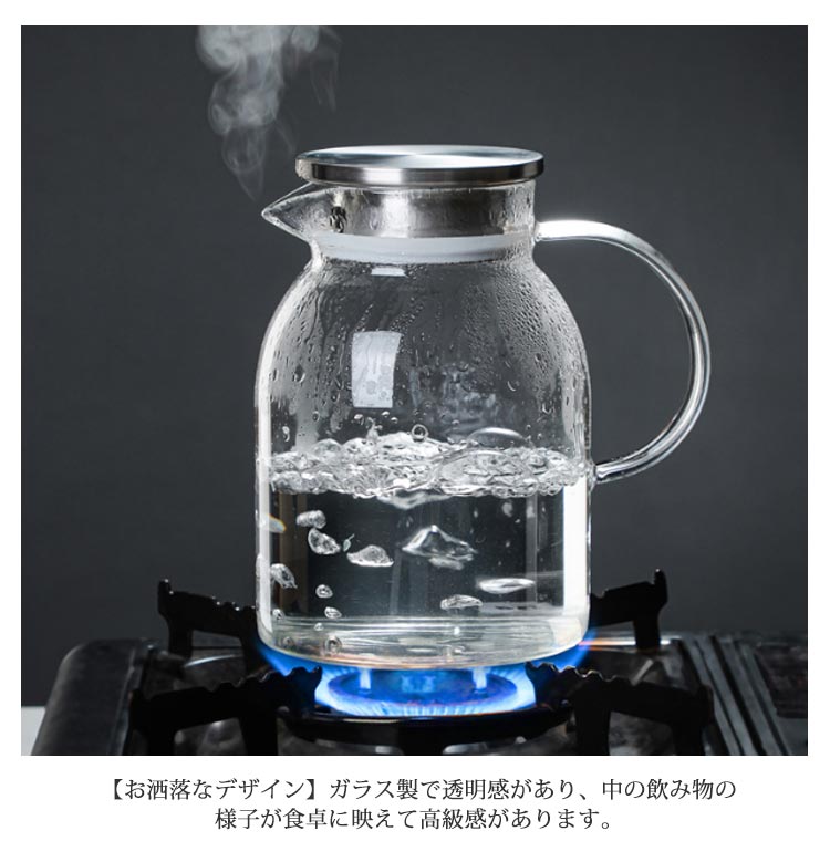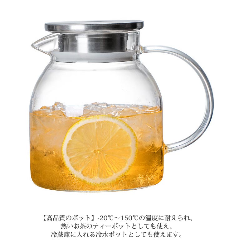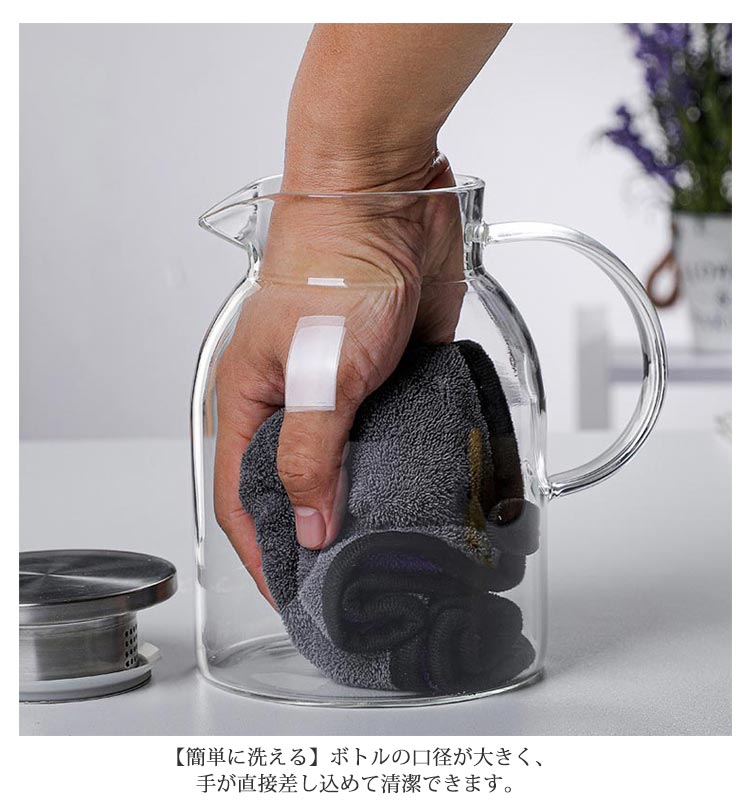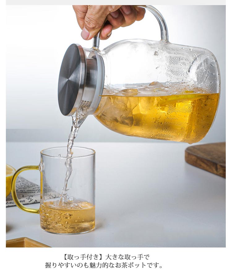 【1200ml・1800ml】【ガラスポット】【直火対応】【直火/電気陶炉対応】直火対応で、冷水だけではなくお湯を沸かすこともできます。電気陶炉もおすすめです。【お洒落なデザイン】ガラス製で透明感があり、中の飲み物の様子が食卓に映えて高級感があります。【簡単に洗える】ボトルの口径が大きく、手が直接差し込めて清潔できます。【高品質のポット】-20℃~150℃の温度に耐えられ、熱いお茶のティーポットとしても使え、冷蔵庫に入れる冷水ポットとしても使えます。【取っ手付き】大きな取っ手で握りやすいのも魅力的なお茶ポットです。【フィルター付き】小目フィルターは茶葉や花茶、お茶バッグをご使用いただけます。大目フィルターは大粒の果肉を通します。