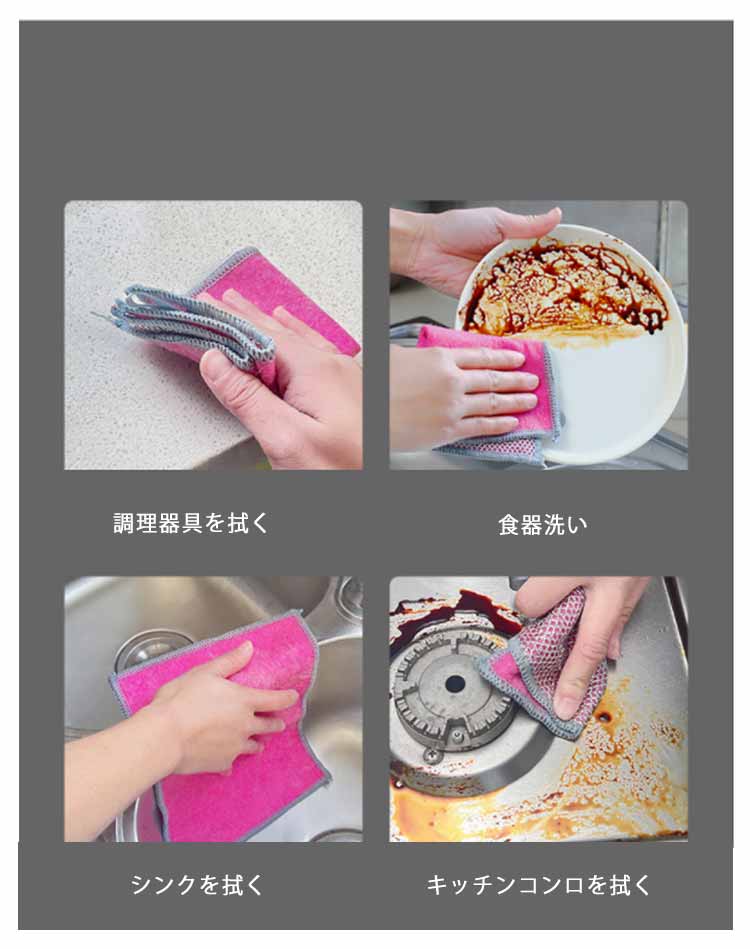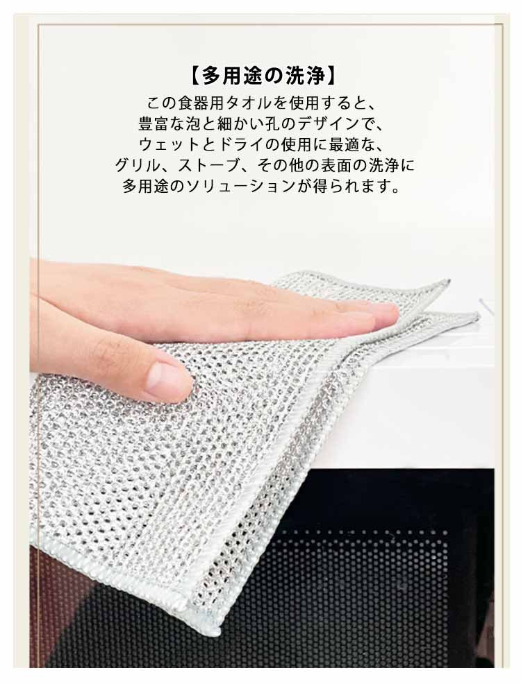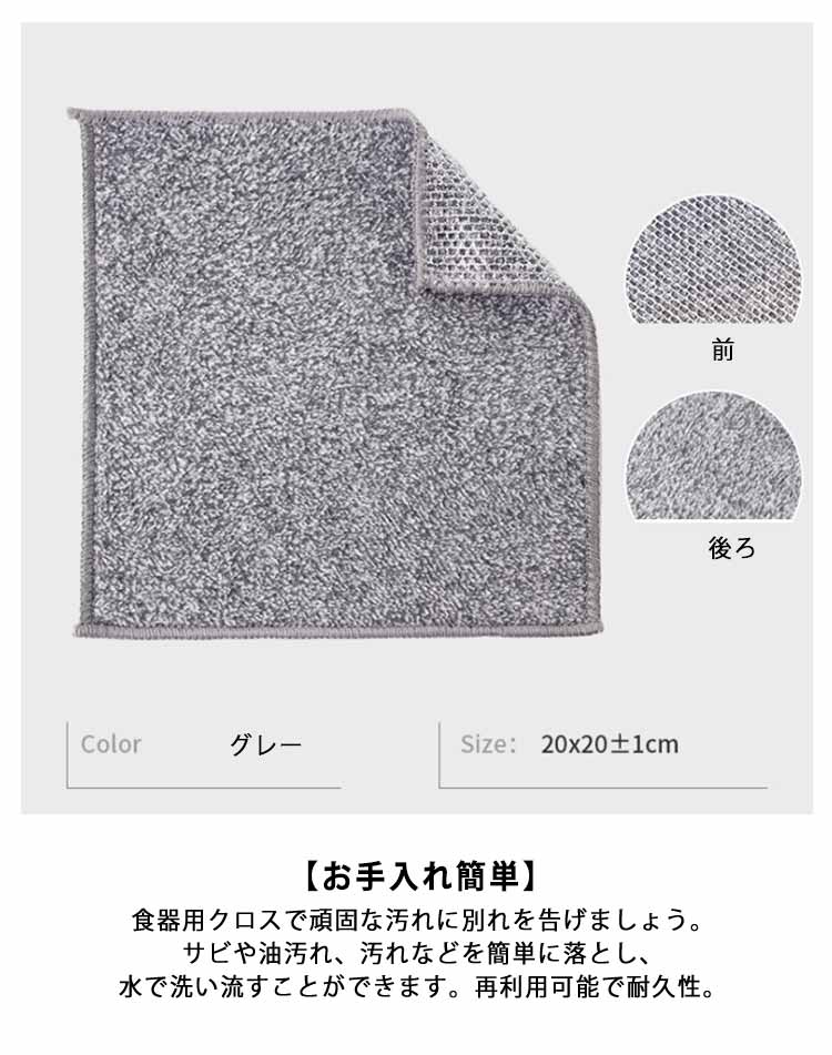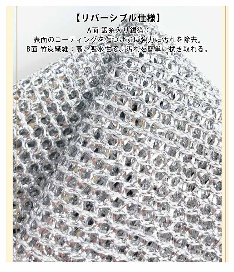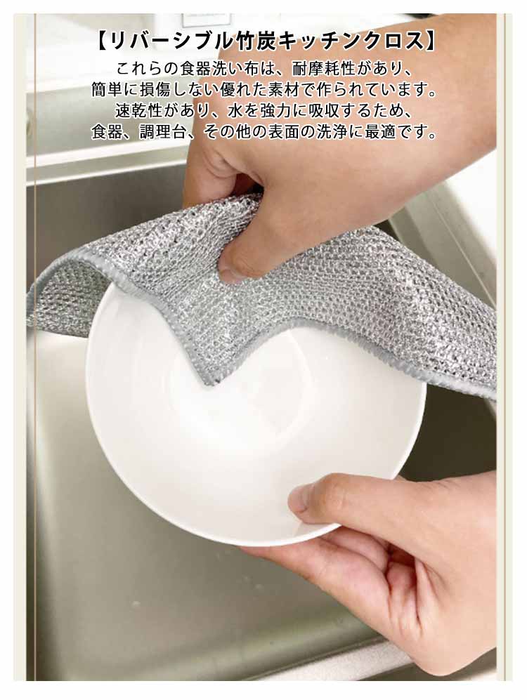 リバーシブル 竹炭キッチンクロス 10枚セット優れた吸水性・油汚れ対策・耐久性竹炭キッチンクロス、優れた吸水性・油汚れ対策・耐久性、マイクロファイバー+リバーシブル仕様、食器、油汚れ、ニオイには雑巾が役立つ。【リバーシブル仕様】A面 銀糸入り錫箔:表面のコーティングを傷つけずに強力に汚れを除去。B面 竹炭繊維:高い吸水性で、汚れを簡単に拭き取れる。両面使用、洗浄力。使いやすい お手入れも簡単、油汚れがくっつきにくいため、時短便利を叶う。【リバーシブル竹炭キッチンクロス】これらの食器洗い布は、耐摩耗性があり、簡単に損傷しない優れた素材で作られています。速乾性があり、水を強力に吸収するため、食器、調理台、その他の表面の洗浄に最適です。【高度なクリーニング】当社の食器洗い布を使用すると、皿、鍋、グリル、コンロの表面を傷つけることなく、食器を簡単に掃除できます。強力な洗浄フォーミュラにより、手を傷つけることなく頑固な汚れを確実に除去します。【多用途の洗浄】この食器用タオルを使用すると、豊富な泡と細かい孔のデザインで、ウェットとドライの使用に最適な、グリル、ストーブ、その他の表面の洗浄に多用途のソリューションが得られます。食器や鍋、フライパンなども簡単に洗えます。【幅広い用途】車、ガラス、家電製品、家具、宝石などを掃除する必要がある場合でも、当社の多目的ワイヤーふきんはあらゆる作業に対応できます。【お手入れ簡単】食器用クロスで頑固な汚れに別れを告げましょう。サビや油汚れ、汚れなどを簡単に落とし、水で洗い流すことができます。再利用可能で耐久性。