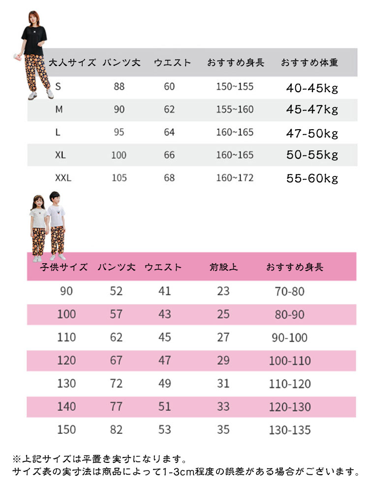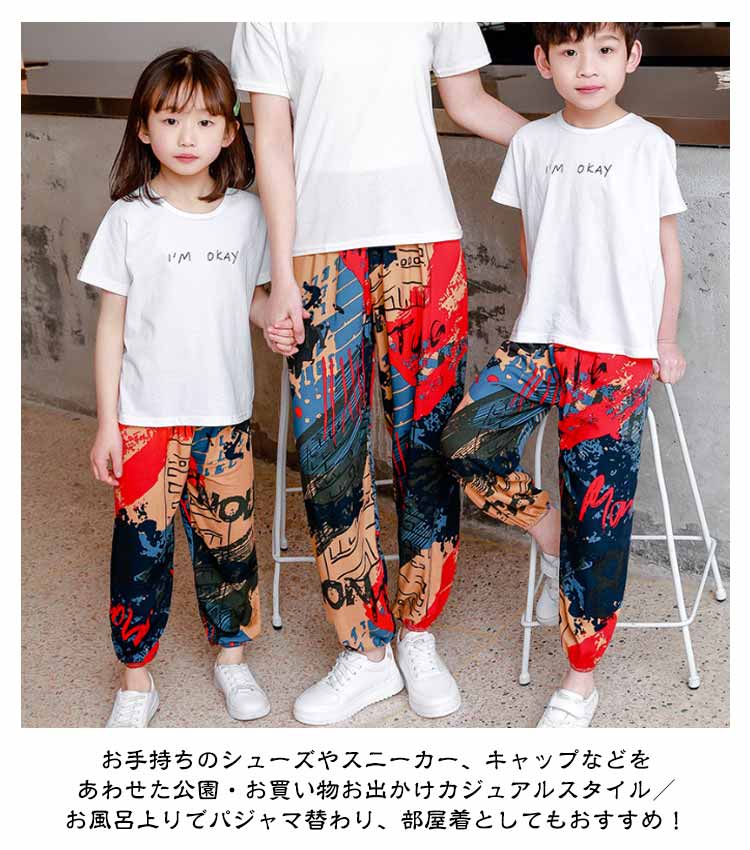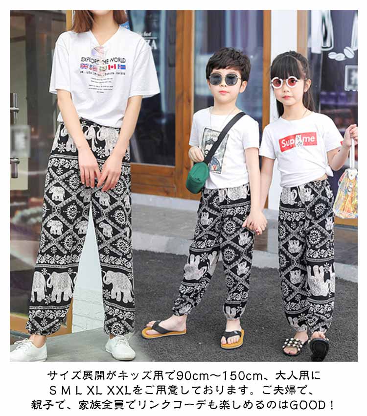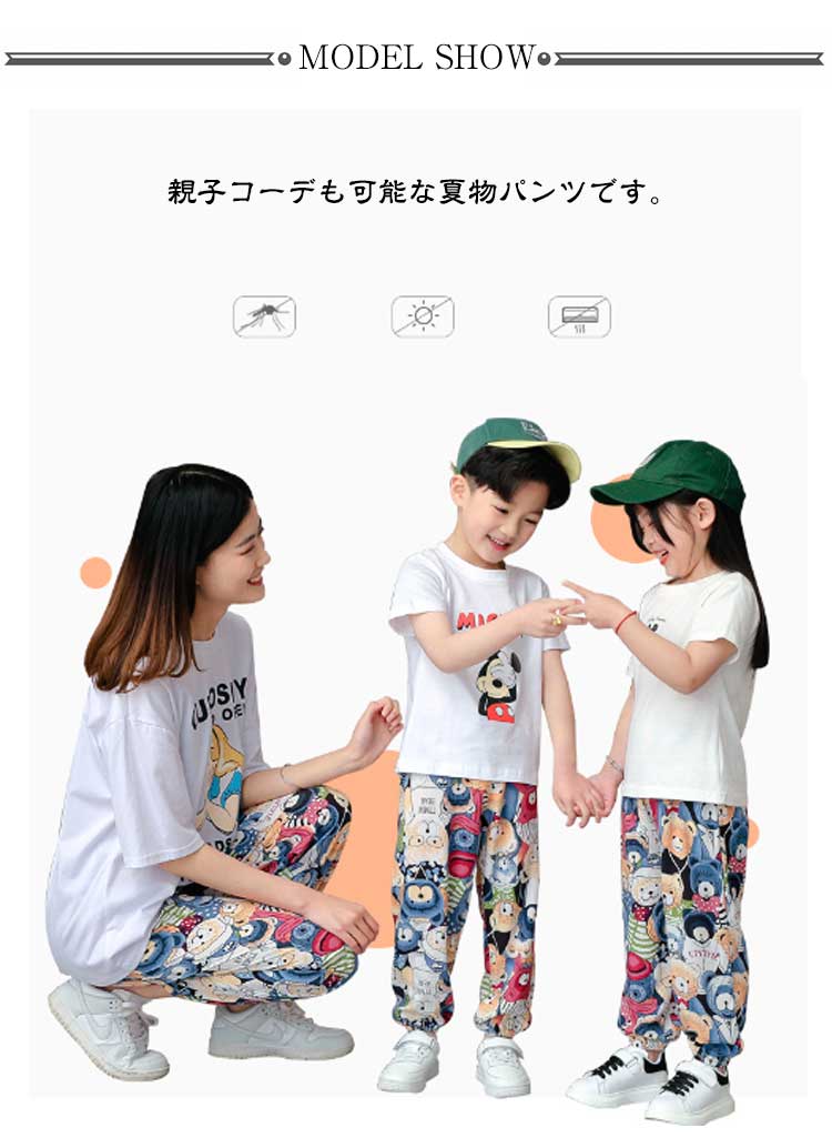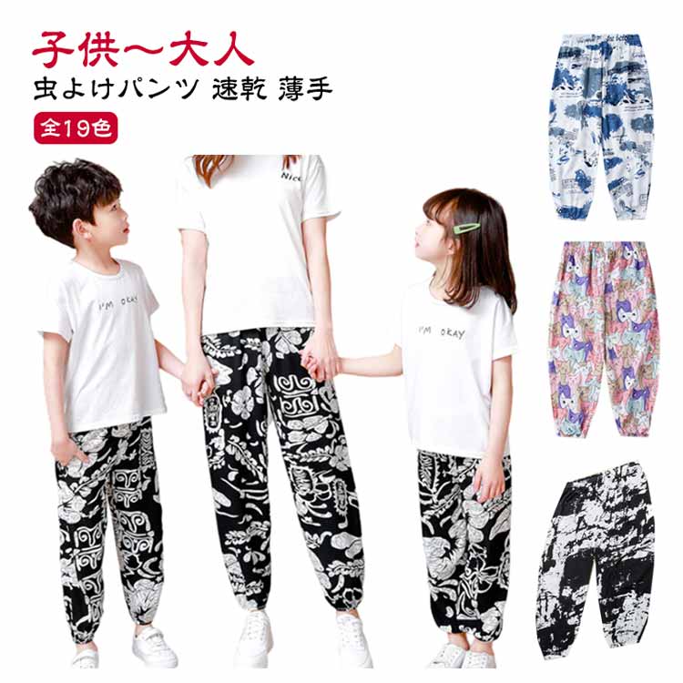 | 【全19色】【子供~大人】【虫よけパンツ】 親子コーデも可能な夏物パンツです。 虫よけの効果も期待でき、お祭りや花火大会などの行楽時にも役に立ちそう! リンクコーデお出かけは迷子対策にもなりますよ。 肌触りのよい薄手の生地&速乾性にも優れるため、汗をかく暑い季節にピッタリです。また、可愛らしいデザインもたくさんありますので、親子コーデも楽しめます。 サイズ展開がキッズ用で90cm~150cm、大人用に S M L XL XXLをご用意しております。ご夫婦で、親子で、家族全員でリンクコーデも楽しめるのはGOOD! 軽くて小さくまとめられ、速乾性もありますのでお出かけの際にも頼りになります。GWやお盆などの長期休暇の際にはぜひ旅行バッグに忍ばせておくと役に立てると思います。 お手持ちのシューズやスニーカー、キャップなどをあわせた公園?お買い物お出かけカジュアルスタイル/お風呂上りでパジャマ替わり、部屋着としてもおすすめ! | |