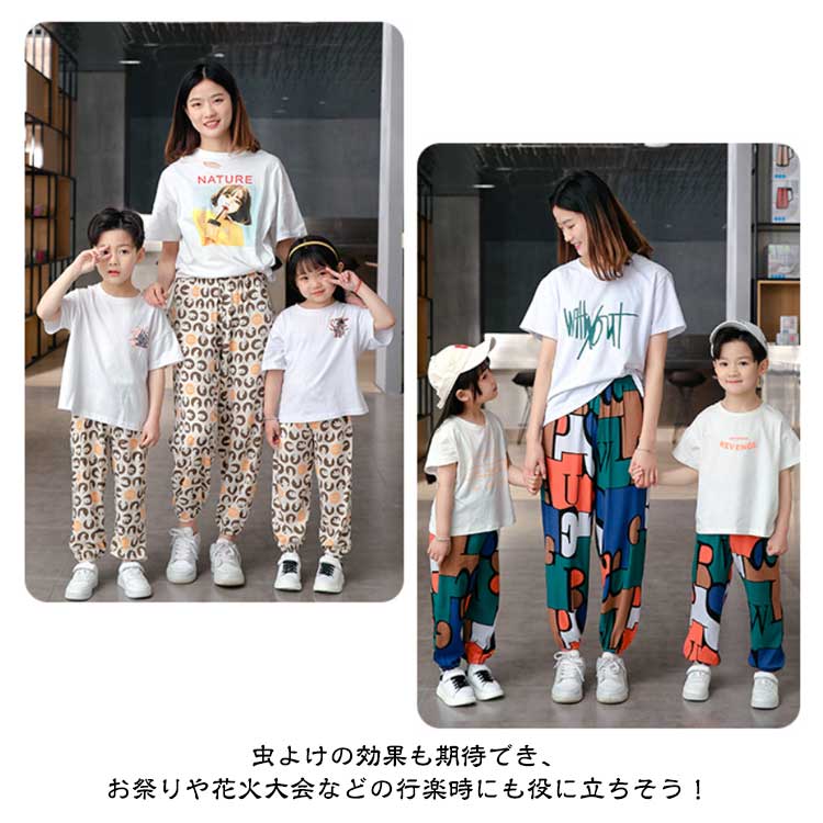 【全19色】【子供~大人】【虫よけパンツ】親子コーデも可能な夏物パンツです。虫よけの効果も期待でき、お祭りや花火大会などの行楽時にも役に立ちそう!リンクコーデお出かけは迷子対策にもなりますよ。肌触りのよい薄手の生地&速乾性にも優れるため、汗をかく暑い季節にピッタリです。また、可愛らしいデザインもたくさんありますので、親子コーデも楽しめます。サイズ展開がキッズ用で90cm~150cm、大人用に S M L XL XXLをご用意しております。ご夫婦で、親子で、家族全員でリンクコーデも楽しめるのはGOOD!軽くて小さくまとめられ、速乾性もありますのでお出かけの際にも頼りになります。GWやお盆などの長期休暇の際にはぜひ旅行バッグに忍ばせておくと役に立てると思います。お手持ちのシューズやスニーカー、キャップなどをあわせた公園・お買い物お出かけカジュアルスタイル/お風呂上りでパジャマ替わり、部屋着としてもおすすめ!
