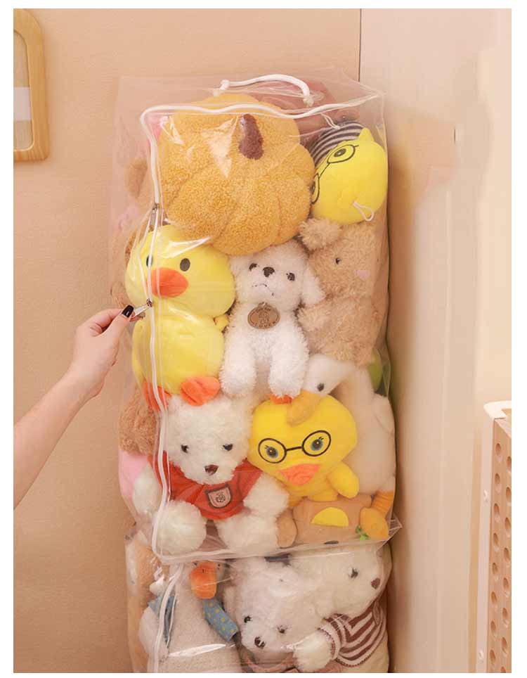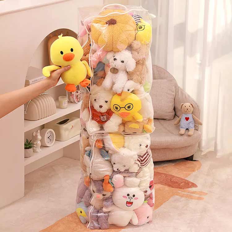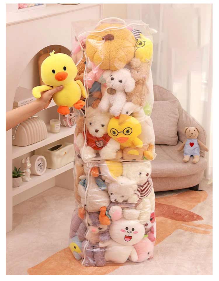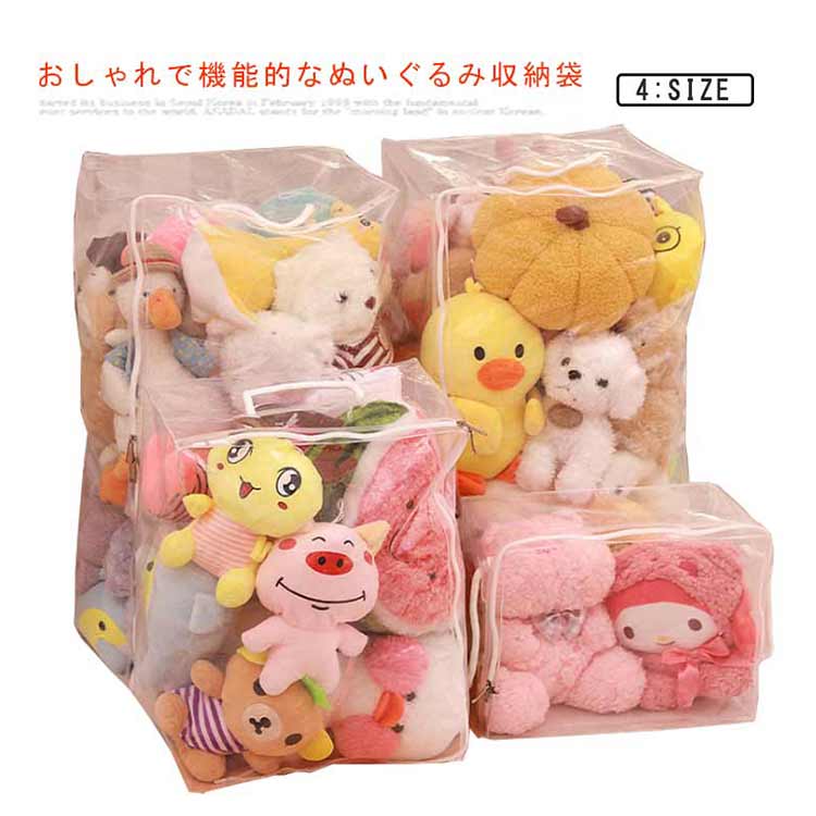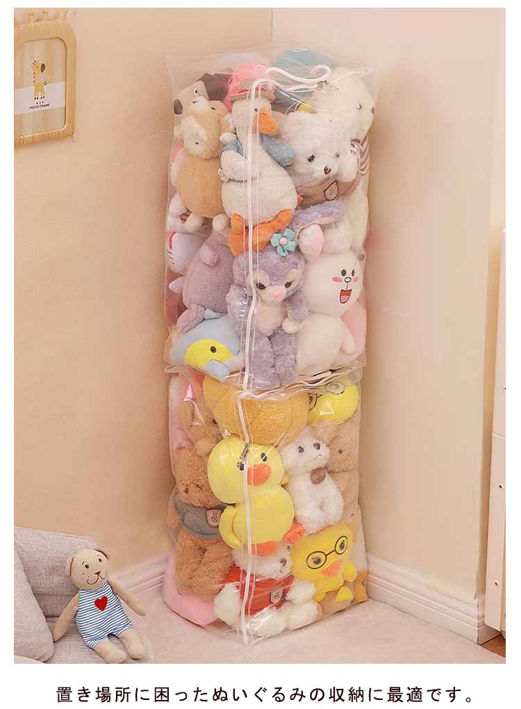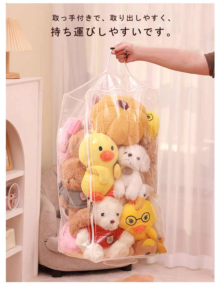| おしゃれで機能的なぬいぐるみ収納袋 透明の素材なので、おしゃれに収納でき、ファスナーを開けずに中身の確認が簡単にできます。 取っ手付きで、取り出しやすく、持ち運びしやすいです。 置き場所に困ったぬいぐるみの収納に最適です。 ぬいぐるみはもちろん、バッグ、ストール、マフラー、ベルトなどのファッション小物を入れておくのにもオススメ。 | |