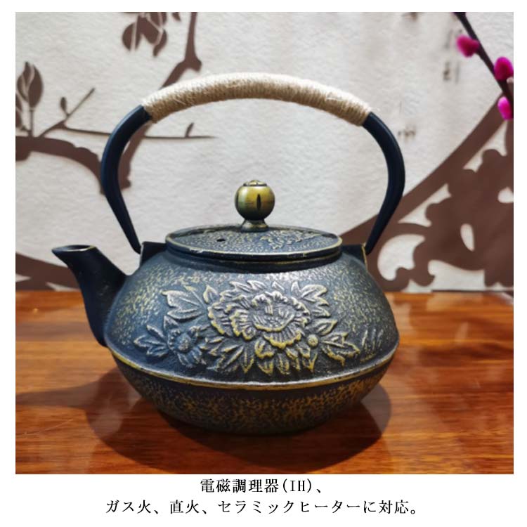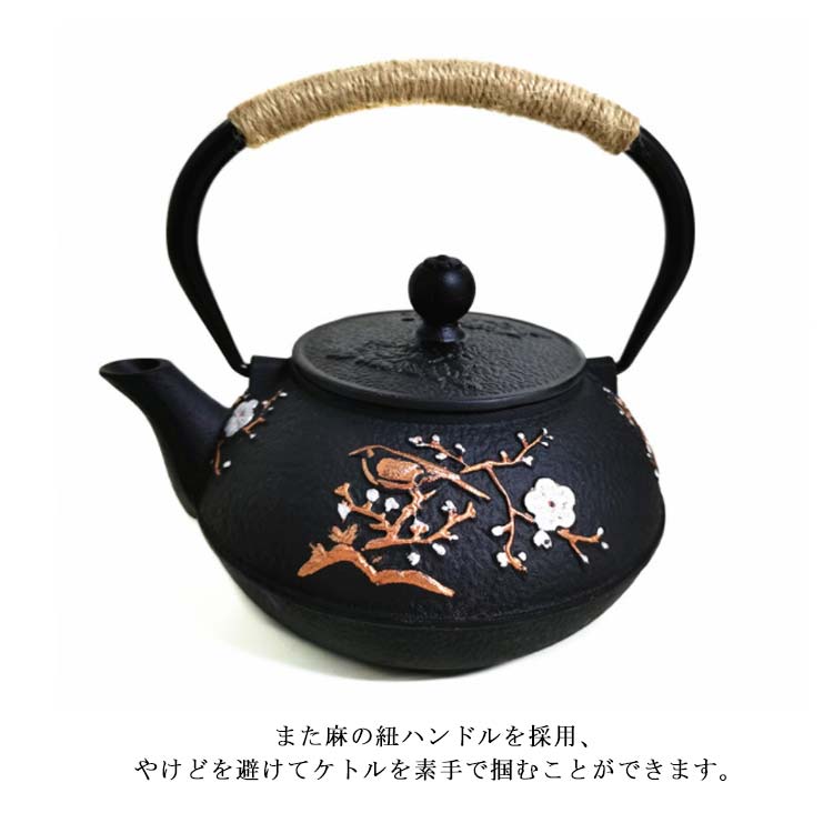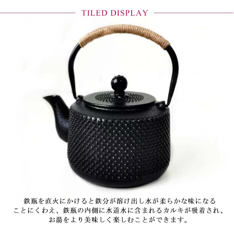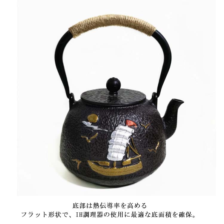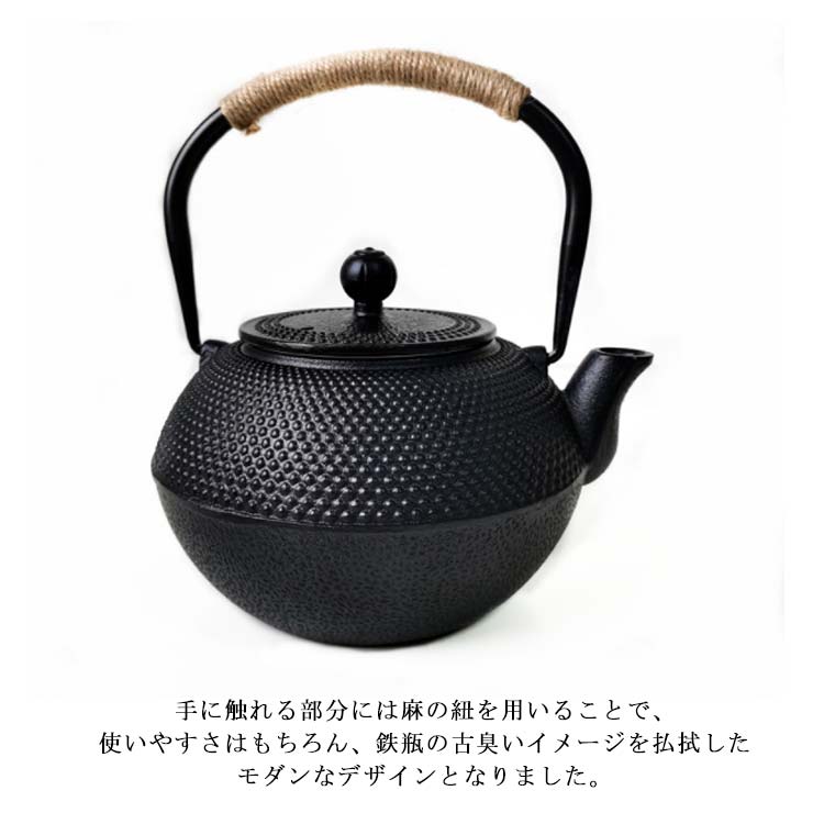 お茶を好きな人のために、生まれった鉄瓶。ih/ガス火対応。【800ml】鉄瓶を直火にかけると鉄分が溶け出し水が柔らかな味になることにくわえ、鉄瓶の内側に水道水に含まれるカルキが吸着され、お湯をより美味しく楽しむことができます。手に触れる部分には麻の紐を用いることで、使いやすさはもちろん、鉄瓶の古臭いイメージを払拭したモダンなデザインとなりました。また麻の紐ハンドルを採用、やけどを避けてケトルを素手で掴むことができます。底部は熱伝導率を高めるフラット形状で、IH調理器の使用に最適な底面積を確保。電磁調理器(IH)、ガス火、直火、セラミックヒーターに対応。普段使いだけでなく、新築・引越し・結婚式などにも喜ばれる「スマート」ギフトとしても◎