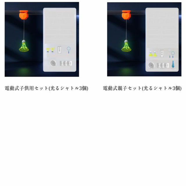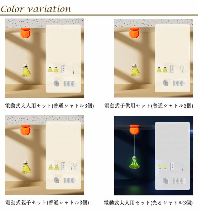 | 色 | 電動式大人用セット(普通) 電動式子供用セット(普通) 電動式親子セット(普通) 電動式大人用セット(光るシャトル) 電動式子供用セット(光るシャトル) 電動式親子セット(光るシャトル) |
