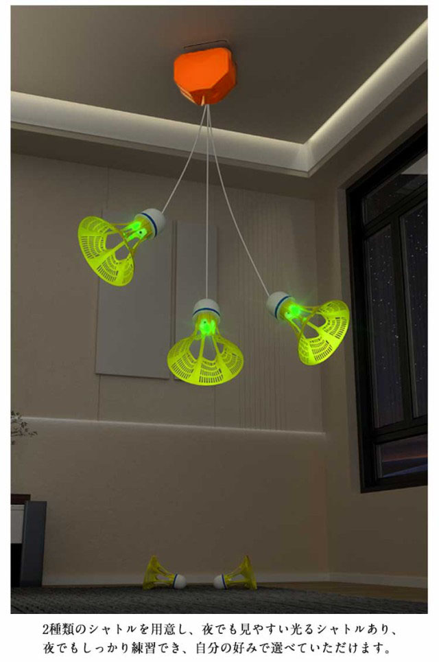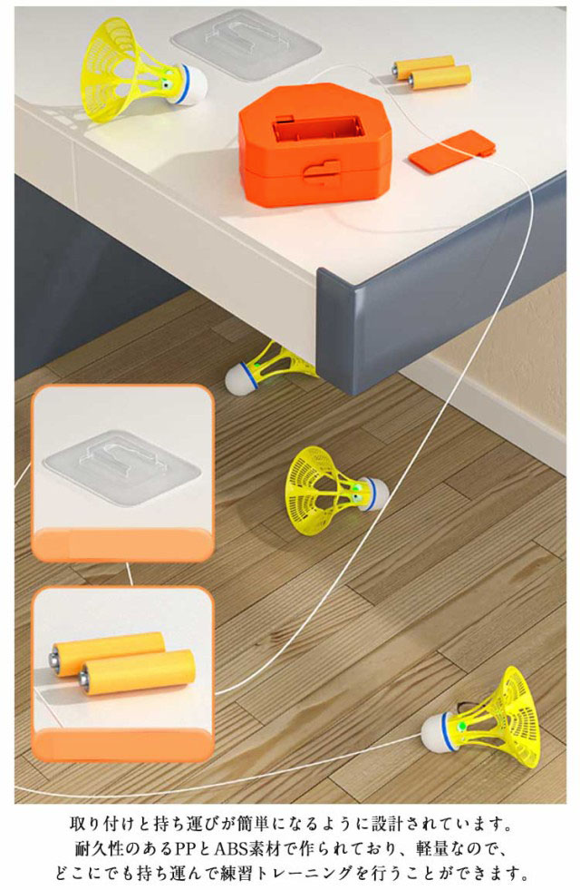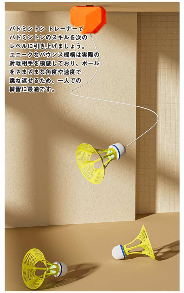 この調整可能なバドミントンデバイスでいつでもどこでもバドミントンを楽しんでください。リビングルーム、バルコニー、庭、公園、遊び場などに設置できます。あらゆる年齢やスキルレベルのバドミントン愛好家に広く使用されています。バドミントン トレーナーでバドミントンのスキルを次のレベルに引き上げましょう。ユニークなバウンス機構は実際の対戦相手を模倣しており、ボールをさまざまな角度や速度で跳ね返せるため、一人での練習に最適です。2種類のシャトルを用意し、夜でも見やすい光るシャトルあり、夜でもしっかり練習でき、自分の好みで選べていただけます。取り付けと持ち運びが簡単になるように設計されています。耐久性のあるPPとABS素材で作られており、軽量なので、どこにでも持ち運んで練習トレーニングを行うことができます。