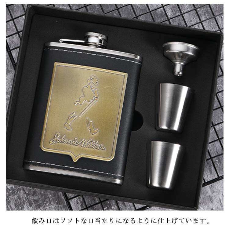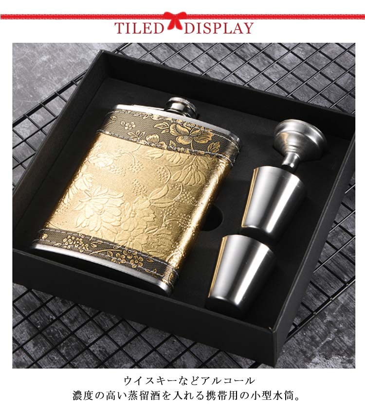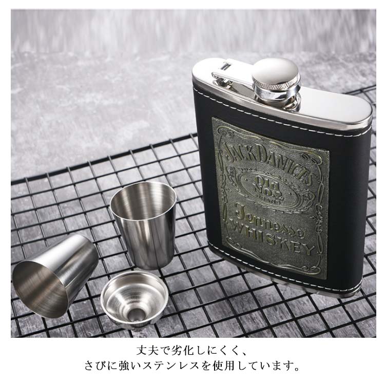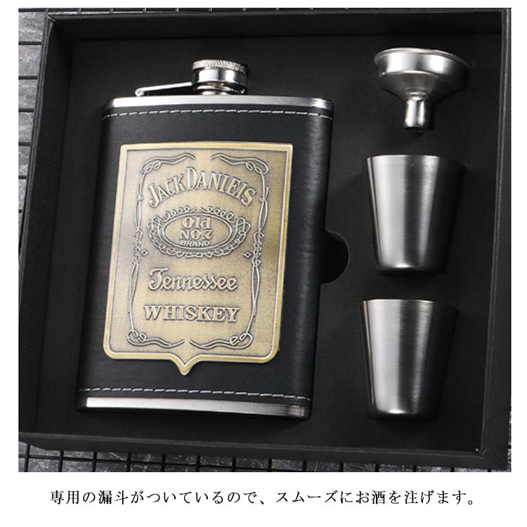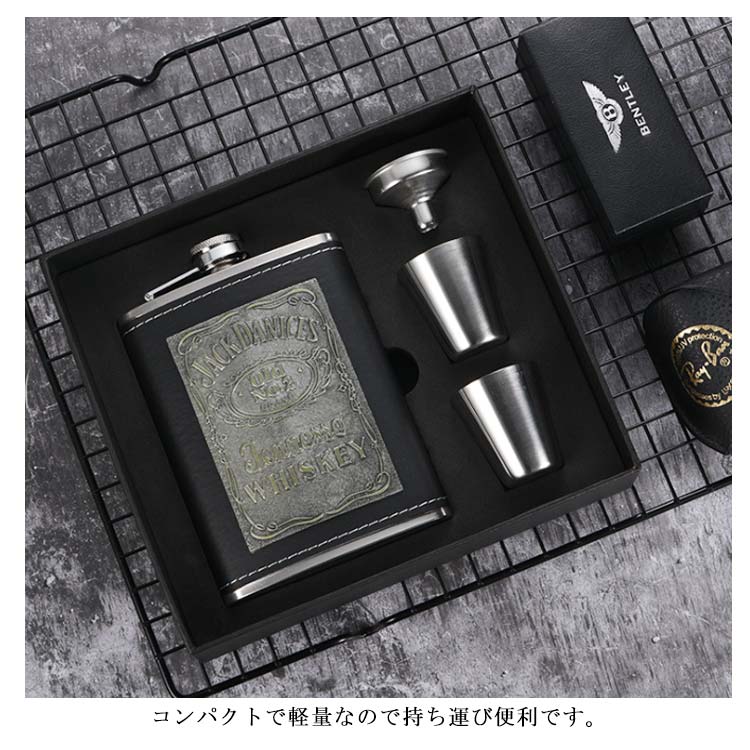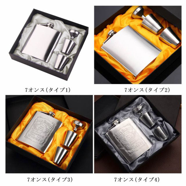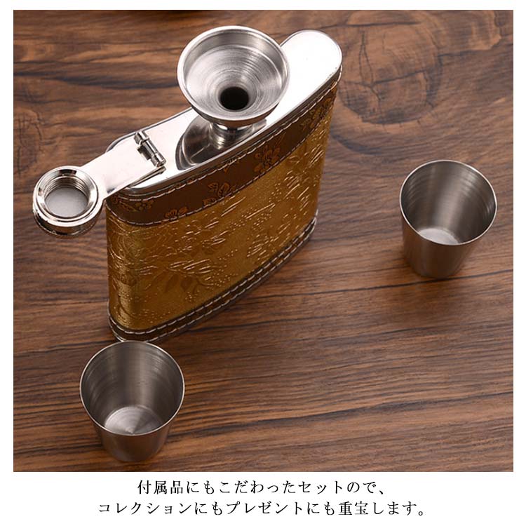 漏斗・コップ付き!スキットルボトル 8オンス 4点セットウイスキーなどアルコール濃度の高い蒸留酒を入れる携帯用の小型水筒。専用の漏斗がついているので、スムーズにお酒を注げます。飲み口はソフトな口当たりになるように仕上げています。コンパクトで軽量なので持ち運び便利です。丈夫で劣化しにくく、さびに強いステンレスを使用しています。フタは本体と一体型なので落としたりする心配はありません。付属品にもこだわったセットので、コレクションにもプレゼントにも重宝します。