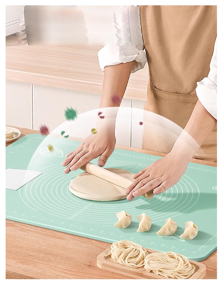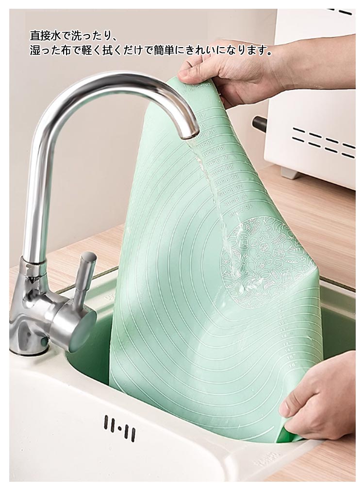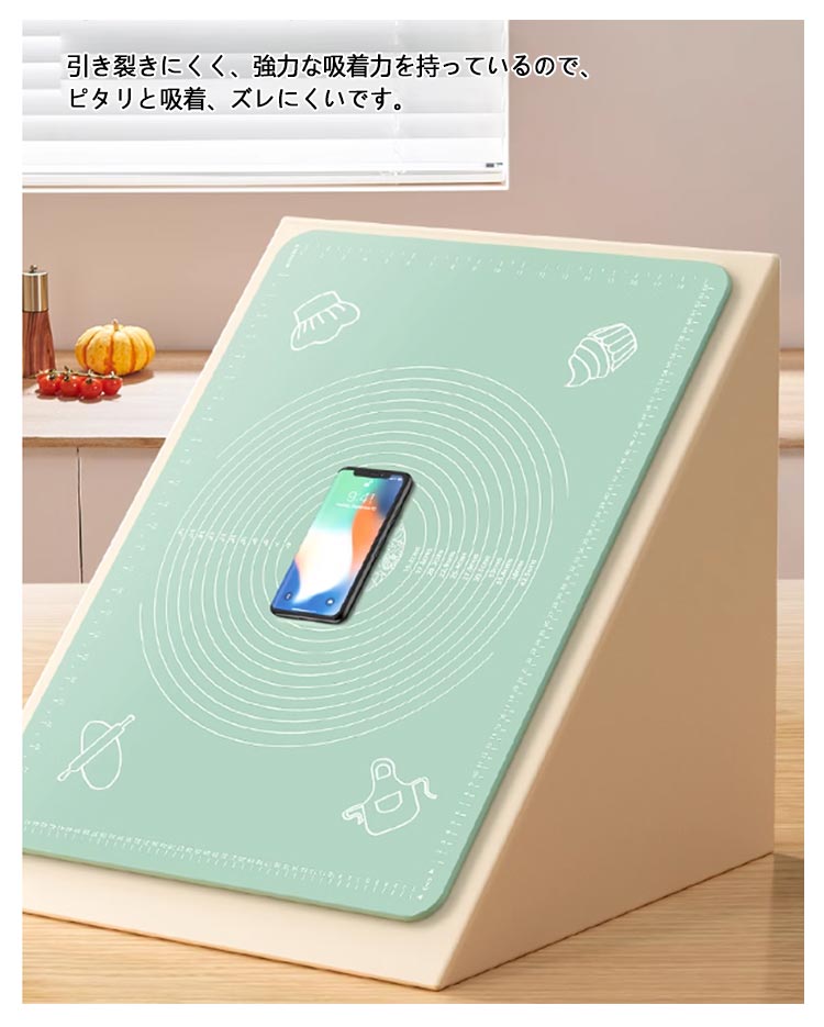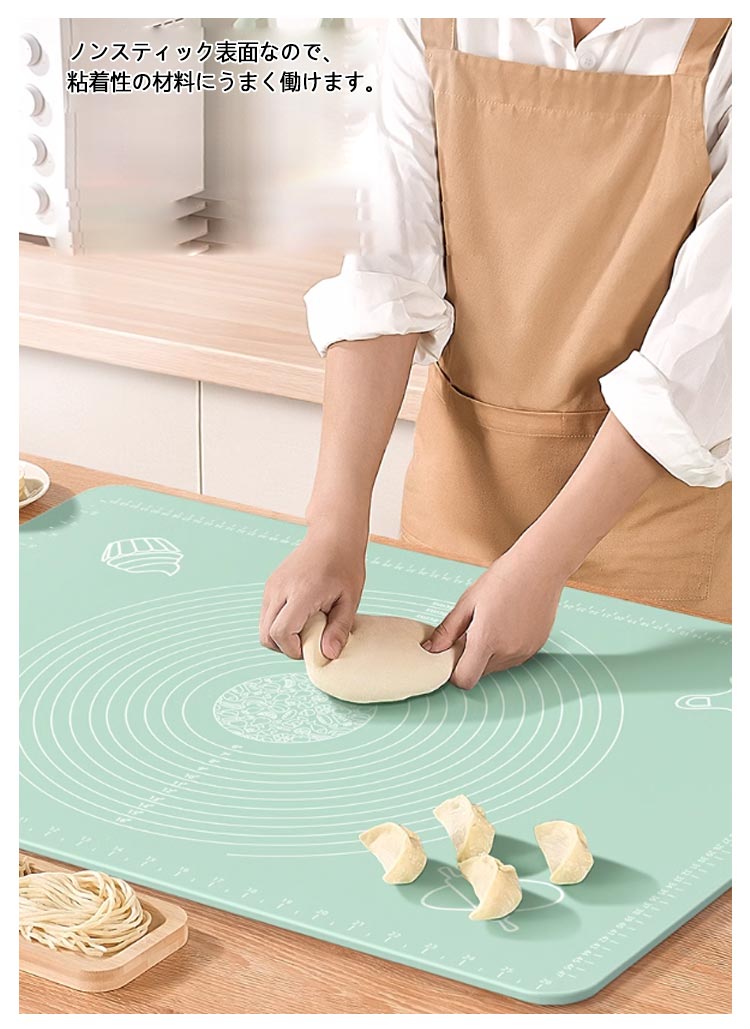 快適にお菓子作りやパン作りが楽しめるシリコンマットです。食品グレードのシリコンから作られて、匂いなし、無毒無害!耐熱性と耐冷性が備えているため、-40℃から230℃までの温度に耐えられます。ノンスティック表面なので、粘着性の材料にうまく働けます。引き裂きにくく、強力な吸着力を持っているので、ピタリと吸着、ズレにくいです。スケールの目盛りも付いているので、パンやお菓子のサイズを揃えるのも簡単です。直接水で洗ったり、湿った布で軽く拭くだけで簡単にきれいになります。折りたたんだり巻いたりしてコンパクトに収納でき、スペースを取らず、繰り返し使用できます。