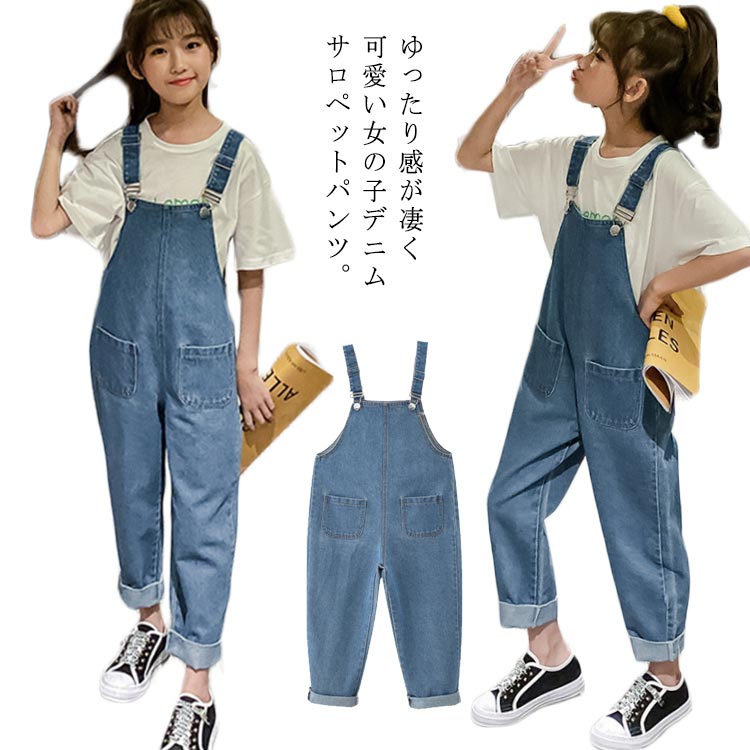 オーバーオール キッズ デニム サロペットパンツ ジュニア 女の子 韓国ファション シンプル 無地 ロングパンツ 子供服 ジーンズ 110 120 130 140 150 160 170 春 夏