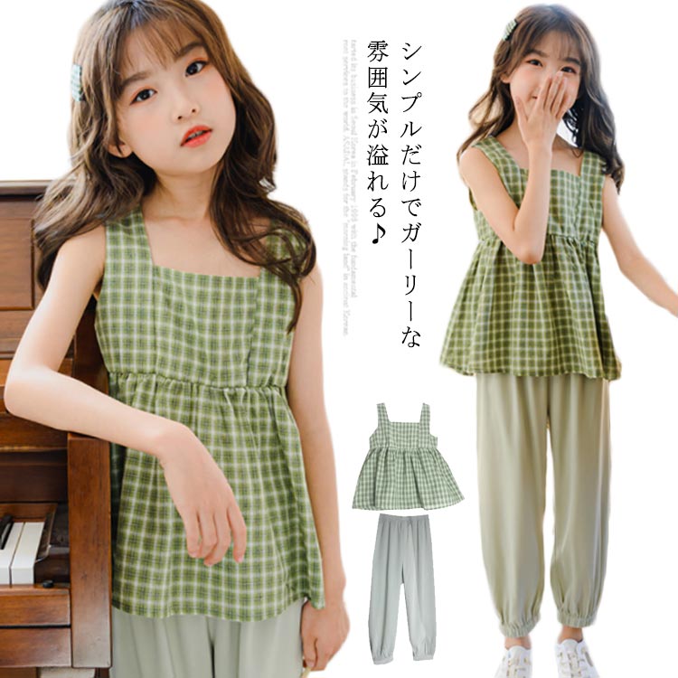 チェック柄 タンクトップ 送料無料 ノースリーブ トップス ジュニア キッズ 女の子 ロングパンツ ジョガーパンツ イージーパンツ ゆる 春 夏 110 120 130 140 150 160 165