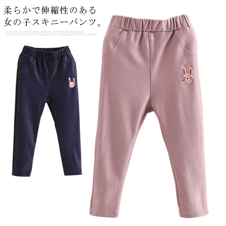 キッズ スキニーパンツ ロングパンツ 送料無料 女の子 うさぎ 刺繍 可愛い 子供服 ストレッチ デニム風 パンツ 長ズボン 春秋 100 110 120 130 140