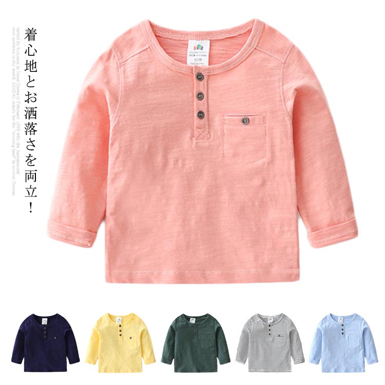 無地 Tシャツ 送料無料 長袖 男の子 子供服 トップス カットソー 春夏 綿100% ボタン付き 大人っぽい おしゃれ 90 100 110 120 130 140