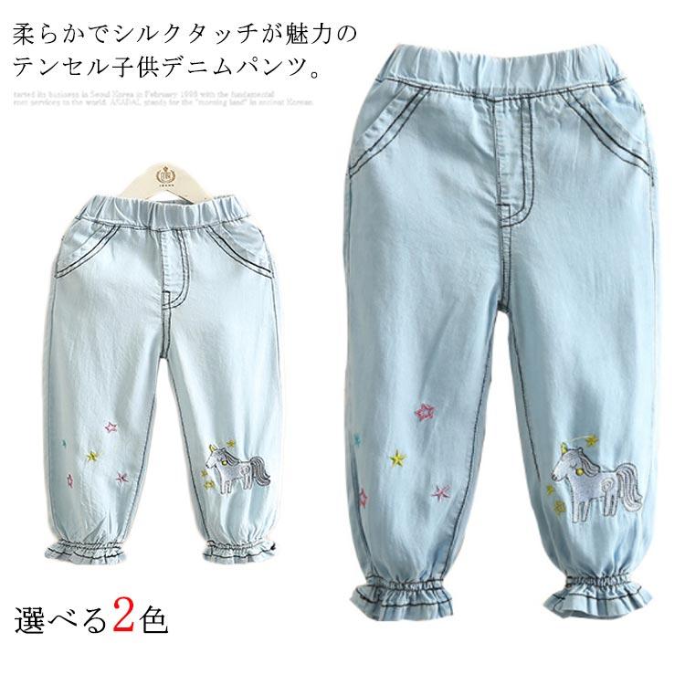 テンセルデニム キッズ デニムパンツ 送料無料 女の子 子供服 ロングパンツ ジョガーパンツ フリル 柔らかい 星 ユニコーン 刺繍 夏 春 90 100 110 120 130 140