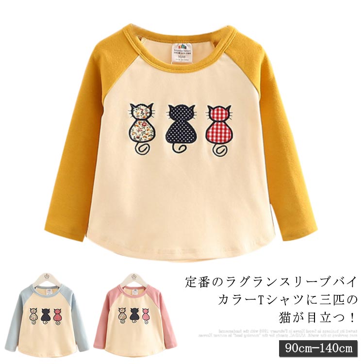 子供服 長袖 トップス Tシャツ 送料無料 キッズ ラグランスリーブ 色切替 猫モチーフ カットソー 幼児 女の子 春 秋 90 100 110 120 130 140 通園 通学