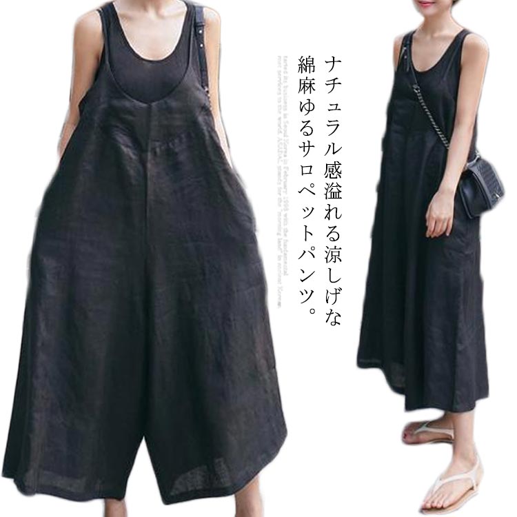 コンビネゾン 送料無料 リネン ワイドパンツ ゆるサロペット スカーチョ キャミソール オーバーオール 無地 薄手 夏 9分丈 マタニティ