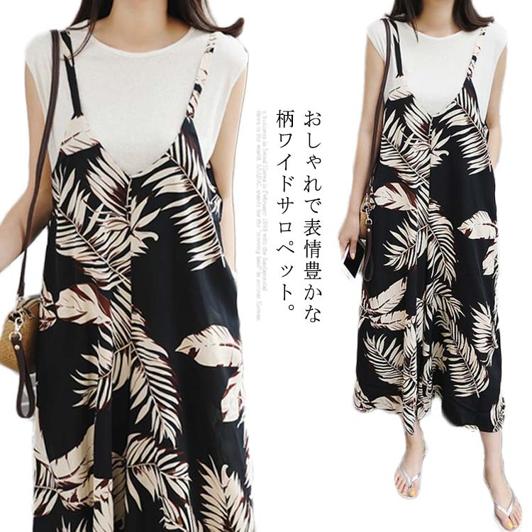 コンビネゾン 送料無料 つなぎ ワイドパンツ ゆるサロペット キャミソール Vネック スカーチョ オールインワン 柄物 薄手 夏 9分丈 マタニティ