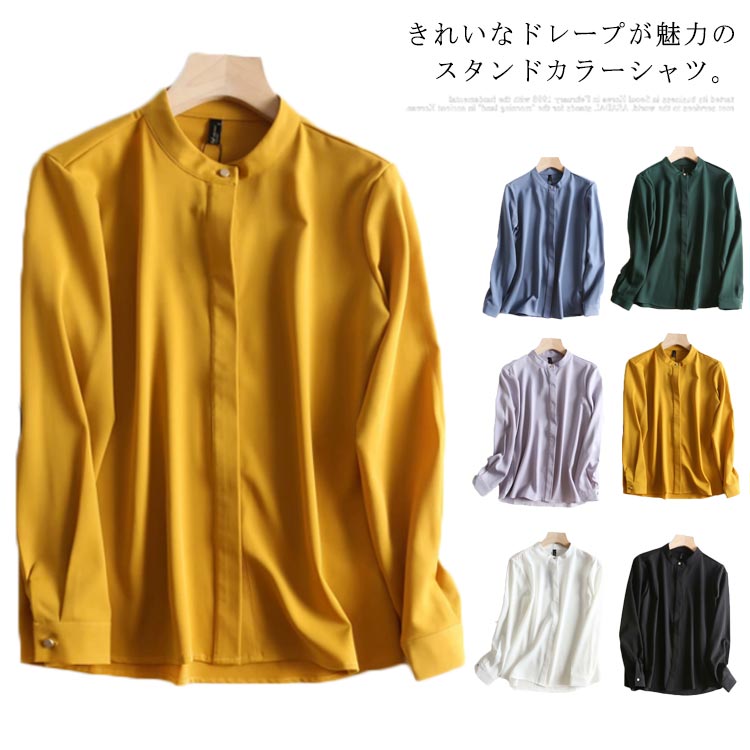 長袖シャツ 送料無料 レディース おしゃれ スタンドカラー 隠しボタン ブラウス シャツブラウス 無地 オフィス ドレープ とろみ おしゃれ