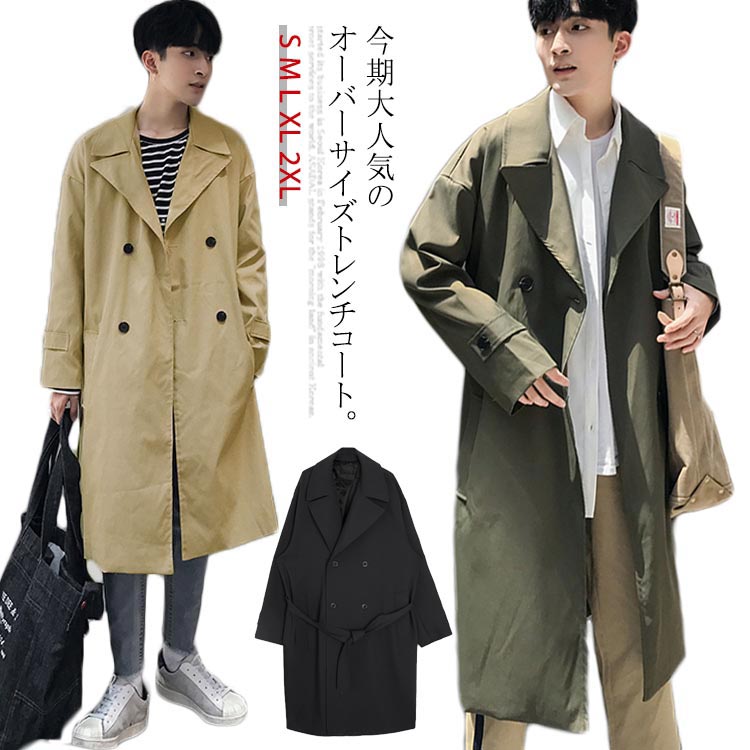 トレンチコート ロング丈 膝下 メンズ ビジネス カジュアル オーバーサイズ ゆったり 無地 通勤 ビックシルエット アウター ジャケット モード ストリート系 春 秋冬 大きいサイズ 小さいサイズ