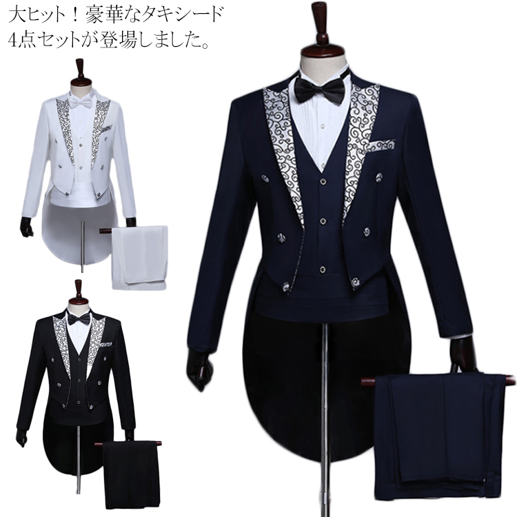 タキシード メンズ 豪華な4点セット 燕尾服 上下セット フォーマル スーツ 演出服 結婚式 お花婿 礼服 コンサート 宴会 パーティー 芸人 お笑い 衣装 出し物 手品 マジック 司会 ジャズウェア 魔術師 公演服 団体服 ステージ衣装 合唱 ピアノ 発表会 演劇