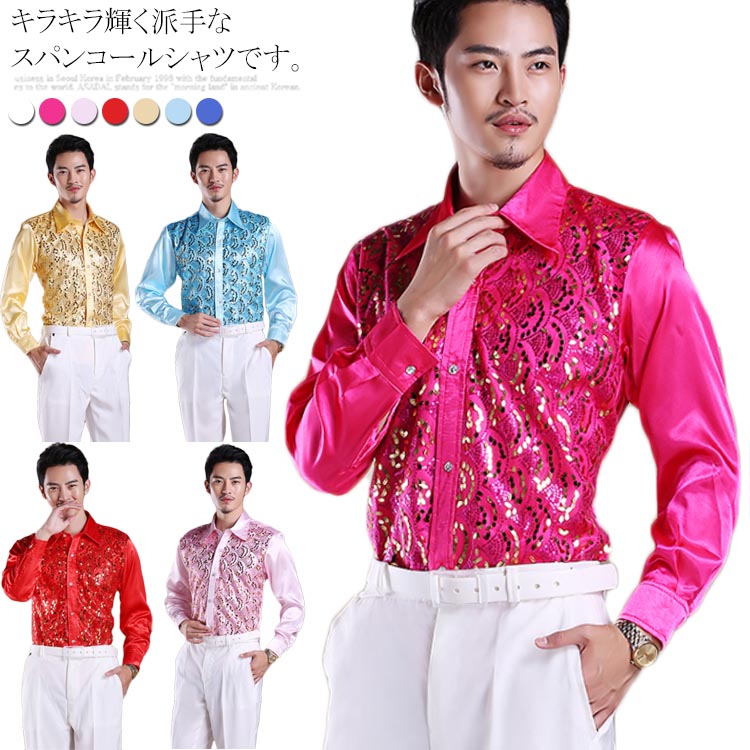 送料無料 スパンコールシャツ メンズ ビジュー付き カラフル キラキラ 長袖シャツ トップス 合唱 演出服 忘年会 派手 演奏会 発表会 結婚式 パーティー イベント 撮影 ステージ衣装 ダンスウェア 司会者 演劇 団体服