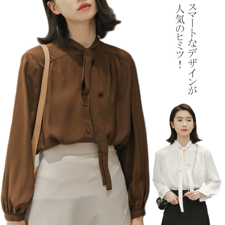 リボンタイ ブラウス 長袖シャツ レディース 無地 ゆったり パフスリーブ 切替 おしゃれ トップス カジュアル お仕事 キレイめ 長袖 シャツ とろみ ドレープ リボン オフィス 秋冬 春 上品 OL 通勤 事務服 20代 30代 40代