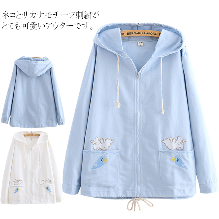 ジャケット ブルゾン パーカー レディース 女の子 可愛い 刺繍 ライトアウター 薄手 羽織り ジップアップ 魚 サカナ 猫 ネコ 2019秋 新作 春 ポケット付き 森ガール 中学生 高校生 通学 通勤 お出かけ
