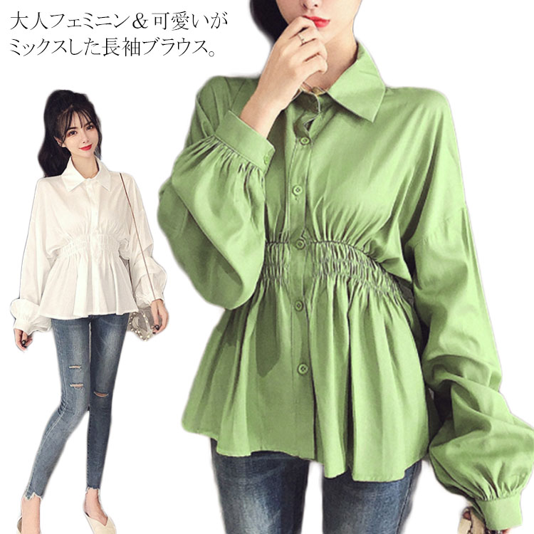 送料無料 ブラウス シャツブラウス パフスリーブ レディース トップス 無地 シンプル ウェストシャーリング ドロップショルダー バルーン袖 長袖 長袖ブラウス 可愛い おしゃれ 春 秋冬