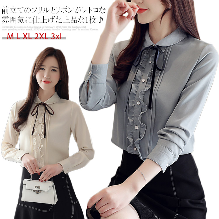 送料無料 シャツブラウス シフォン ブラウス 前たてフリル 長袖シャツ 長袖ブラウス レディース 丸襟 リボン シフォン とろみ シワになりにくい ドレープ 春 秋 カジュアル フォーマル 大きいサイズ 事務 オフィス お仕事 OL 通勤 お呼ばれ お出かけ オシャレ フェミニン