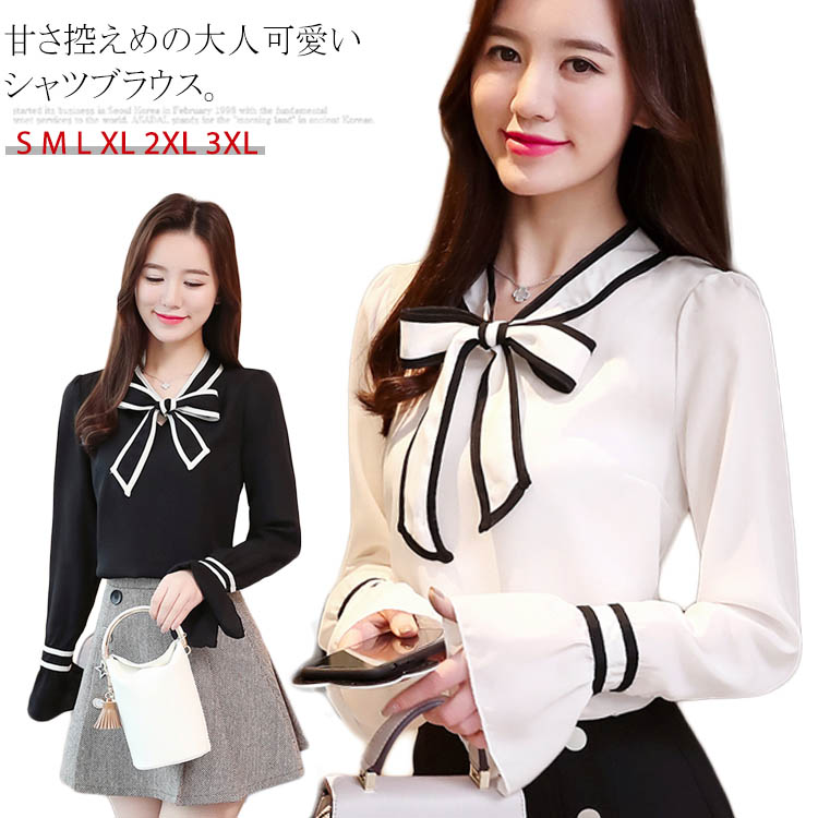 送料無料 リボン ブラウス リボンタイ 長袖 シャツ シャツブラウス プルオーバー ブラウス レディース トップス 無地 フレア袖 可愛い オシャレ オフィス 通勤 デート カジュアル シフォン キレイめ とろみ 秋 リボンシャツ ワイシャツ カジュアル ボウタイ 通勤 OL オフィス