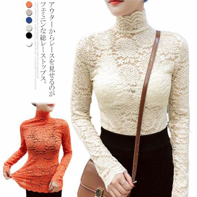 送料無料 シースルーレース トップス セクシー 長袖 透かし 肌見せ レディース レーストップス チュールレースカットソー インナー ハイネック レースブラウス フェミニン チュール シースルー 透け感 オールシーズン 春 夏 秋 冬 プチプラ