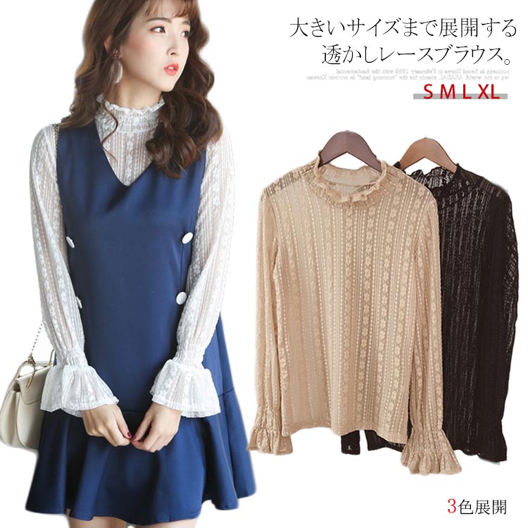 送料無料 ふんわりフリル襟が可愛い シースルーレース ブラウス トップス 長袖 総レース 長袖トップス カットソー レディース インナー フレア袖 重ね着 レイヤード フリル フレア袖 スカラップ裾 花柄レース 刺繍レース 秋 冬 春 夏 お姫様 透かし セクシー コンシャス 20代 30代 40代 50代