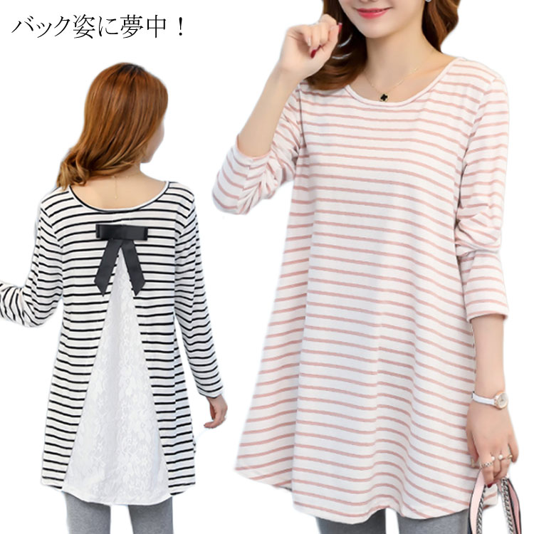 バックレース切替がお洒落! ボーダーTシャツ 長袖カットソー レディース トップス マタニティウェア マタニティトップス お洒落 キレイめ 長袖 春 秋 体型カバー 着痩せ お出かけ 通勤