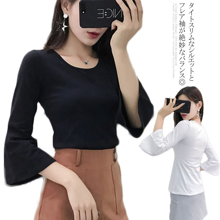 送料無料 ベルスリーブ カットソー フレア袖 レディース Tシャツ カットソー 7分袖 クールネック フレアスリーブ 無地 黒 白 すっきり カジュアル プルオーバー 秋 トップス ワイドスリーブ 綺麗め カジュアル